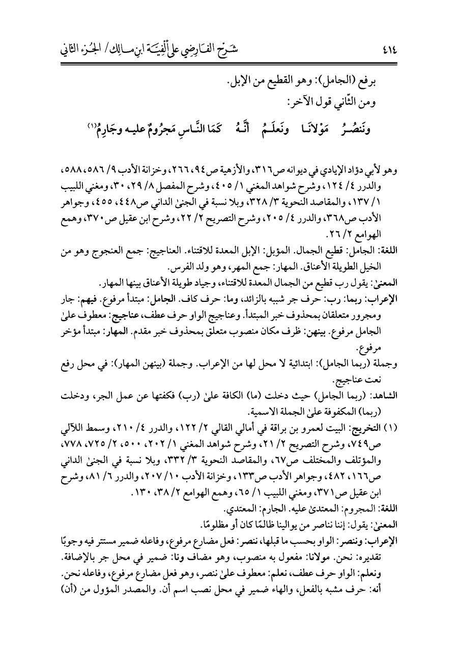 الشاهد: (ربما الجامل) حيث دخلت (ما) الكافة على (رب) فكفتها عن عمل الجر، ودخلت (ربما) المكفوفة على الجملة الاسمية.