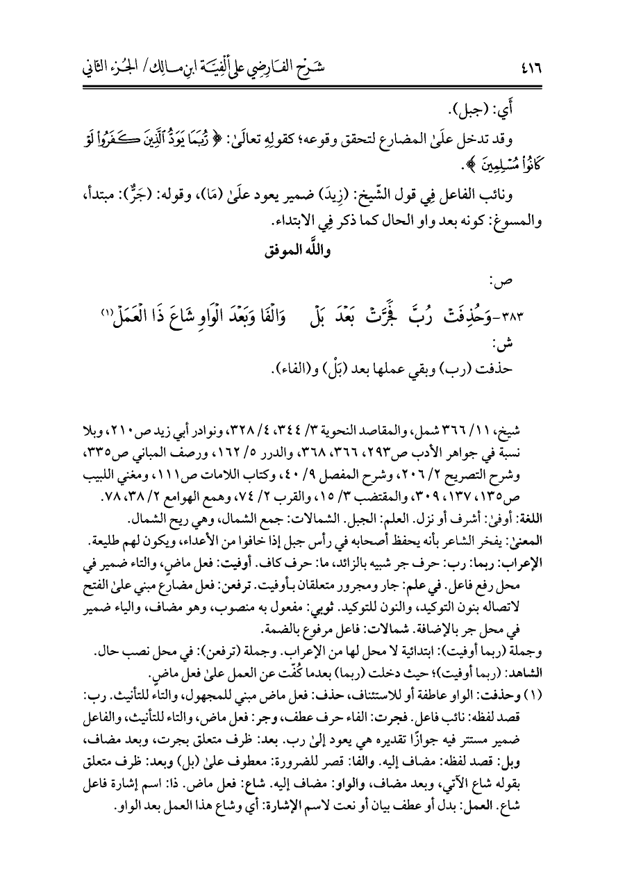 ٣٨٣ - وَحُذِفَتْ رُبَّ فَجَرَّتْ بَعْدَ بَلْ ... وَالْفَا وَبَعْدَ الْوَاوِ شَاعَ ذَا الْعَمَلْ (¬١)