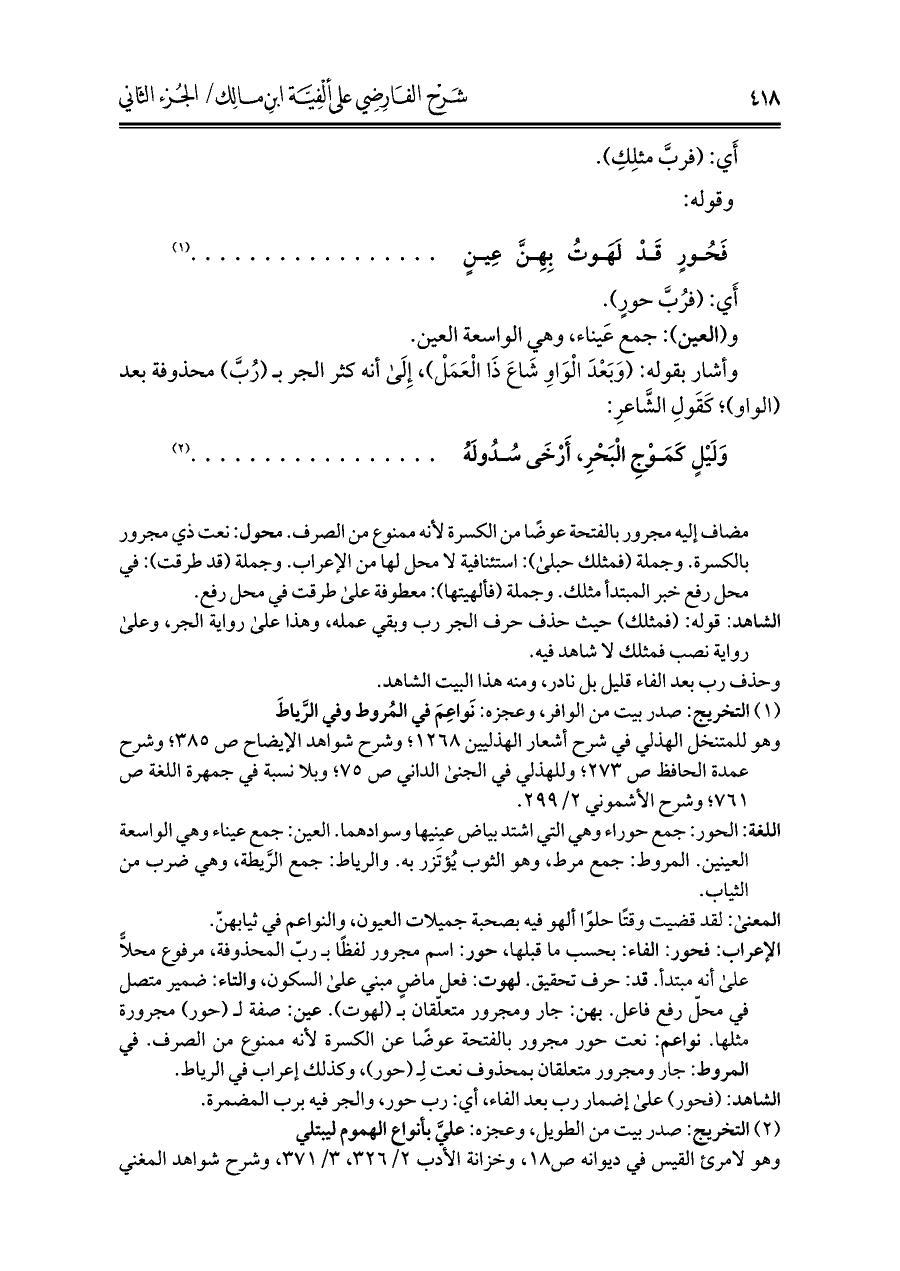 الإعراب: فحور: الفاء: بحسب ما قبلها, حور: اسم مجرور لفظًا بـ ربّ المحذوفة، مرفوع محلًّا على أنه مبتدأ. قد: حرف تحقيق. لهوت: فعل ماضٍ مبني على السكون، والتاء: ضمير متصل في محلّ رفع فاعل. بهن: جار ومجرور متعلّقان بـ (لهوت). عين: صفة لـ (حور) مجرورة مثلها. نواعم: نعت حور مجرور بالفتحة عوضًا عن الكسرة لأنه ممنوع من الصرف. في المروط: جار ومجرور متعلقان بمحذوف نعت لِـ (حور)، وكذلك إعراب في الرياط.