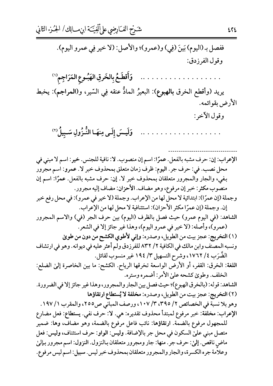 الشاهد: قوله: (بالخرق الهبوع)؛ حيث فصل بين الجار والمجرور، وهذا غير جائز إلا في الضرورة.