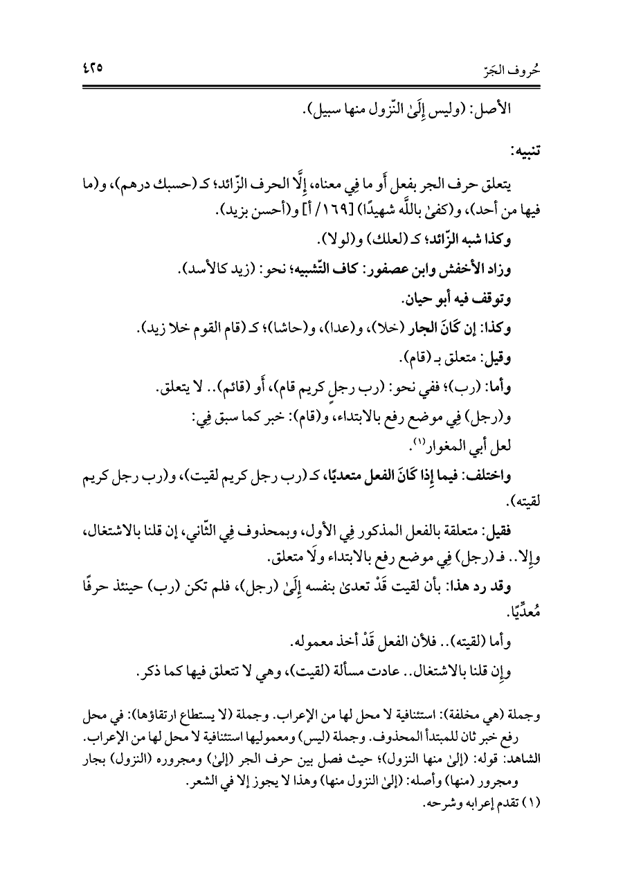 يتعلق حرف الجر بفعل أَو ما فِي معناه، إِلَّا الحرف الزّائد؛ كـ (حسبك درهم)، و (ما فيها من أحد)، و (كفى باللَّه شهيدًا) و (أحسن بزيد).
