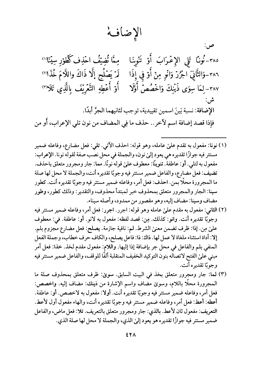 (¬١) نونا: مفعول به تقدم على عامله، وهو قوله: احذف الآتي. تلي: فعل مضارع، وفاعله ضمير مستتر فيه جوازًا تقديره هي يعود إلى نون، والجملة في محل نصب صفة لقوله نونا. الإعراب: مفعول به لتلي. أو: عاطفة. تنوينًا: معطوف على قوله نونًا. مما: جار ومجرور متعلق باحذف. تضيف: فعل مضارع، والفاعل ضمير مستتر فيه وجوبًا تقديره أنت، والجملة لا محل لها صلة ما المجرورة محلًا بمن. احذف: فعل أمر، وفاعله ضمير مستتر فيه وجوبًا تقديره أنت. كطور سينا: الجار والمجرور متعلق بمحذوف خبر لمبتدأ محذوف، والتقدير: وذلك كطور، وطور مضاف وسينا: مضاف إليه، وهو مقصور من ممدود، وأصله سيناء.