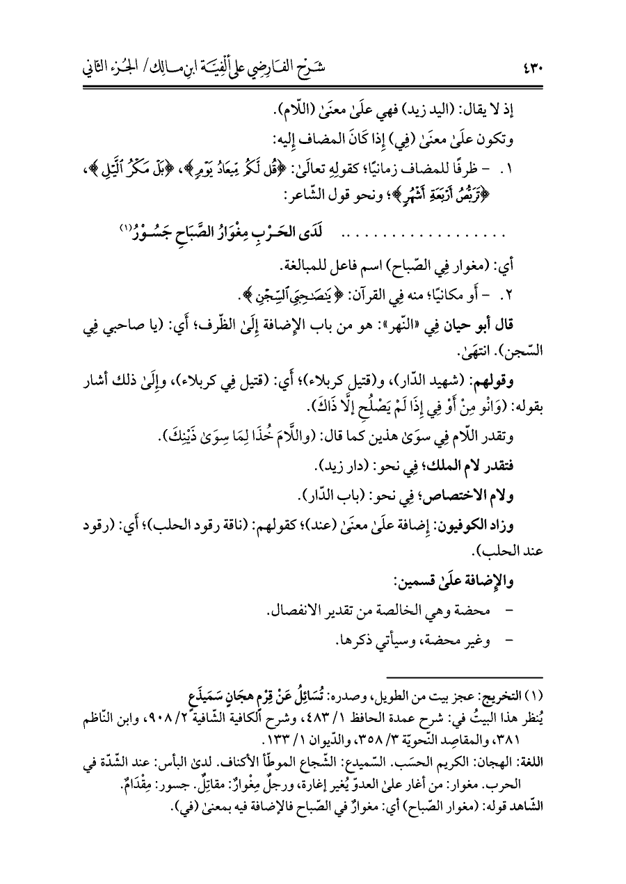 الشّاهد قوله: (مغوار الصّباح) أي: مغوارٌ في الصّباح فالإضافة فيه بمعنى (في).