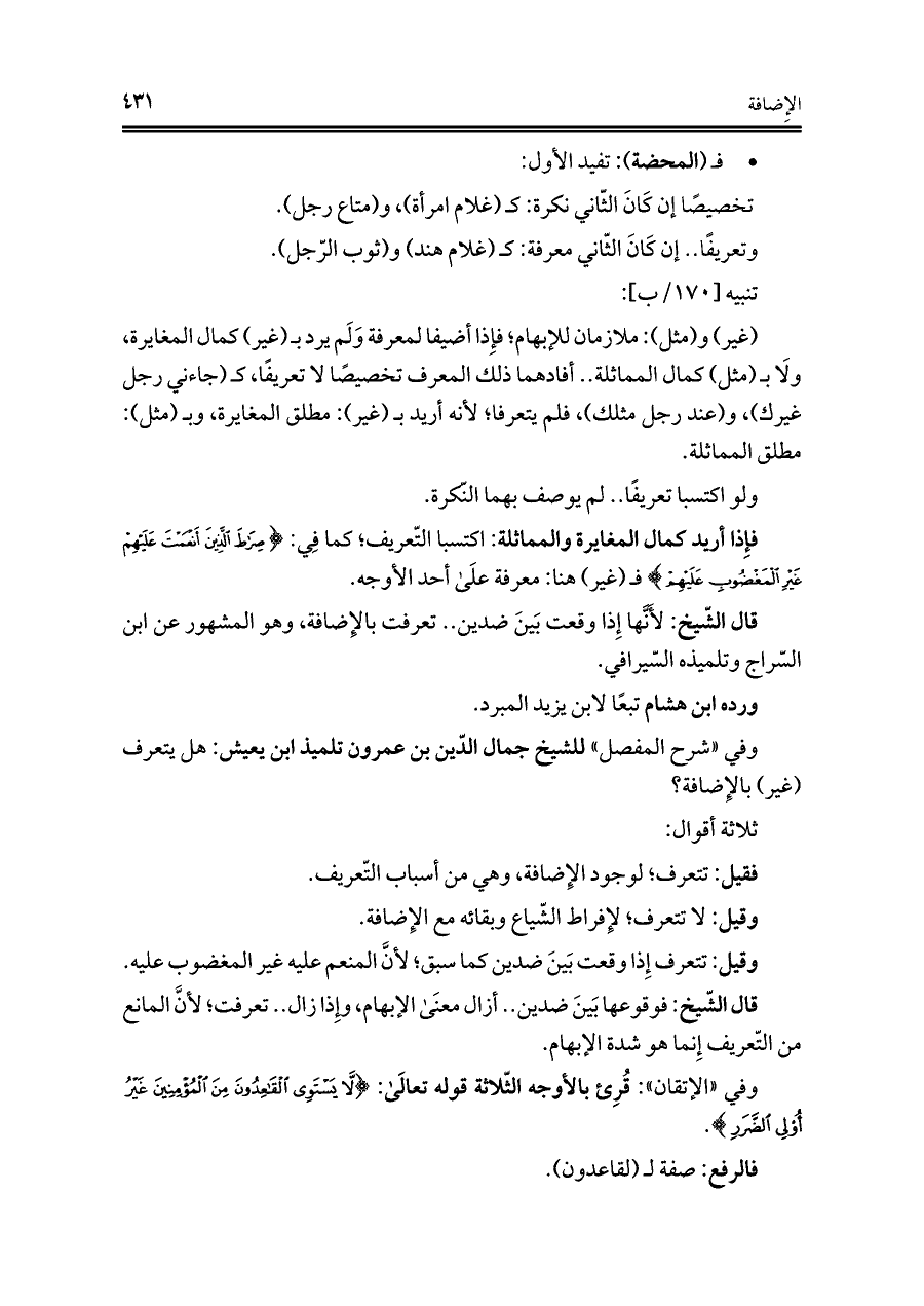 وفي "شرح المفصل" للشيخ جمال الدّين بن عمرون تلميذ ابن يعيش: هل يتعرف (غير) بالإِضافة؟