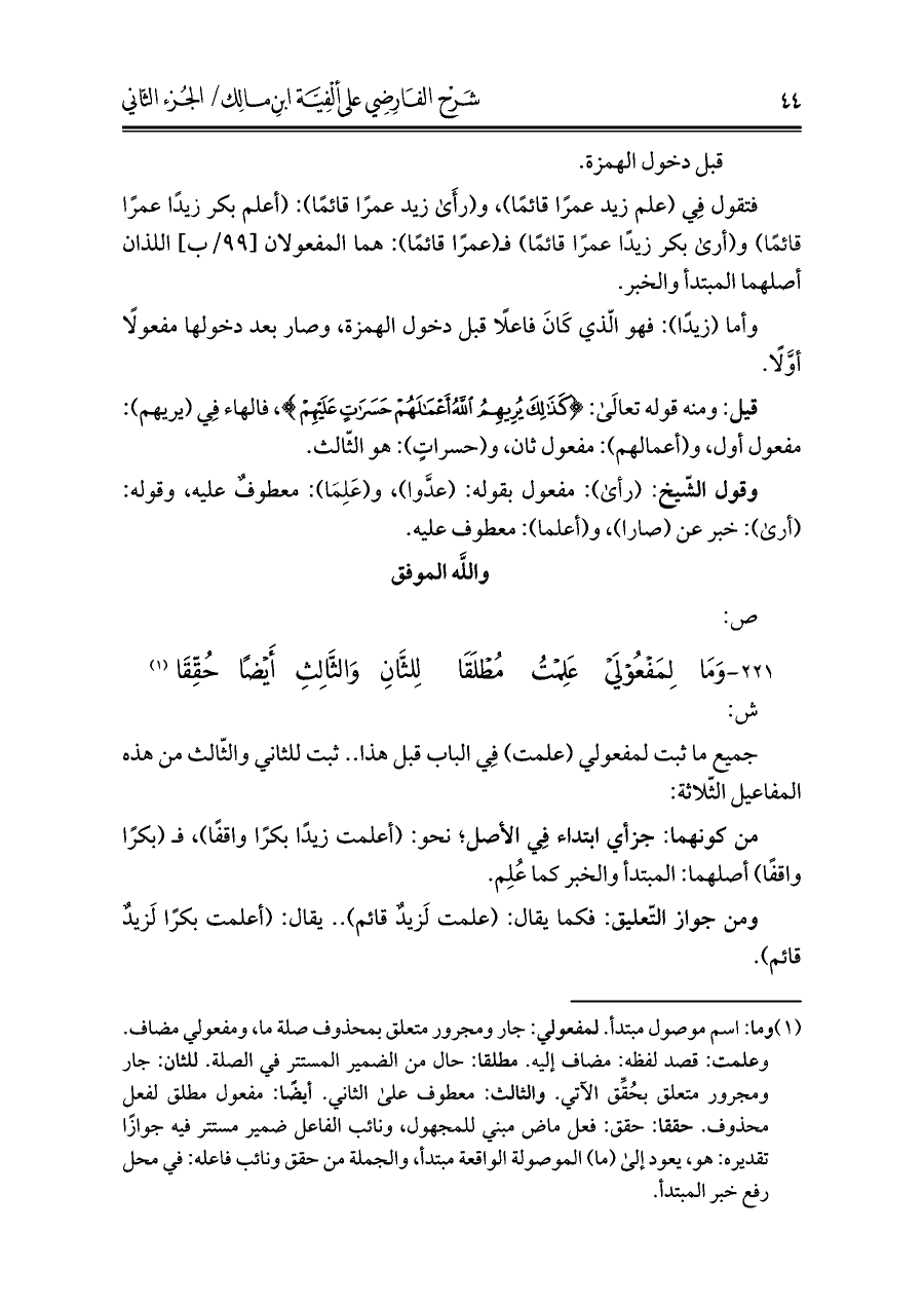 وقول الشّيخ: (رأى): مفعول بقوله: (عدَّوا)، و (عَلِمَا): معطوفٌ عليه، وقوله: (أرى): خبر عن (صارا) و (أعلما): معطوف عليه.
