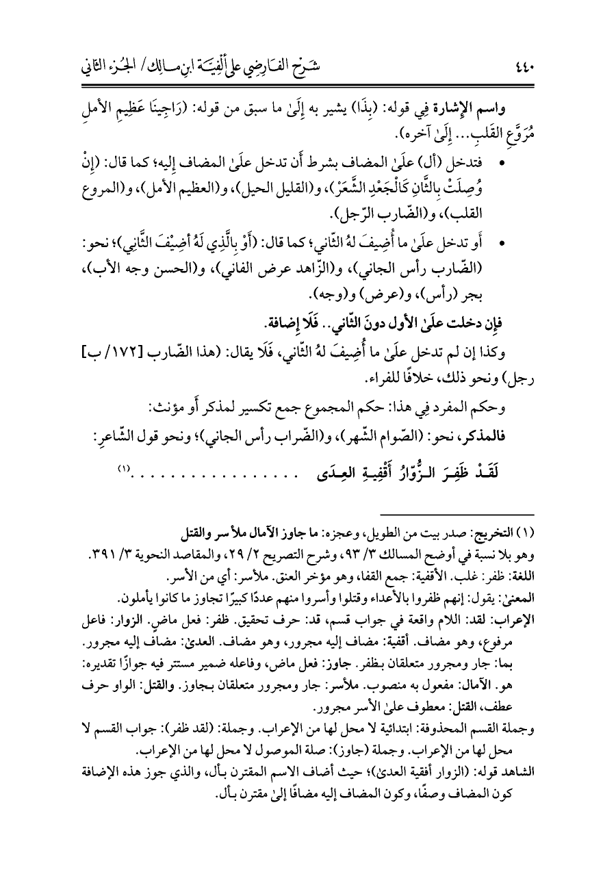 الشاهد قوله: (الزوار أفقية العدى)؛ حيث أضاف الاسم المقترن بأل، والذي جوز هذه الإضافة كون المضاف وصفًا، وكون المضاف إليه مضافًا إلى مقترن بأل.