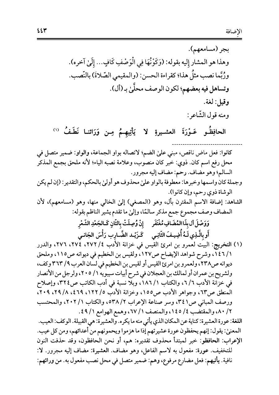 الإعراب: الحافظو: خبر لمبتدأ محذوف تقديره: هم، أو نحن الحافظون، وقد حذفت النون للتخفيف. عورة: مفعول به لاسم الفاعل، وهو مضاف. العشيرة: مضاف إليه مجرور. لا: نافية. يأتيهم: فعل مضارع مرفوع، وهم: ضمير متصل في محل نصب مفعول به. من ورائهم: