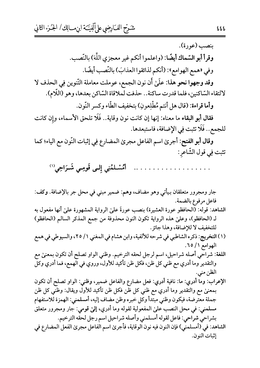 الشاهد: في (أمسلمني) فإن النون فيه نون الوقاية، فأجرى اسم الفاعل مجرى الفعل المضارع في إثبات النون.