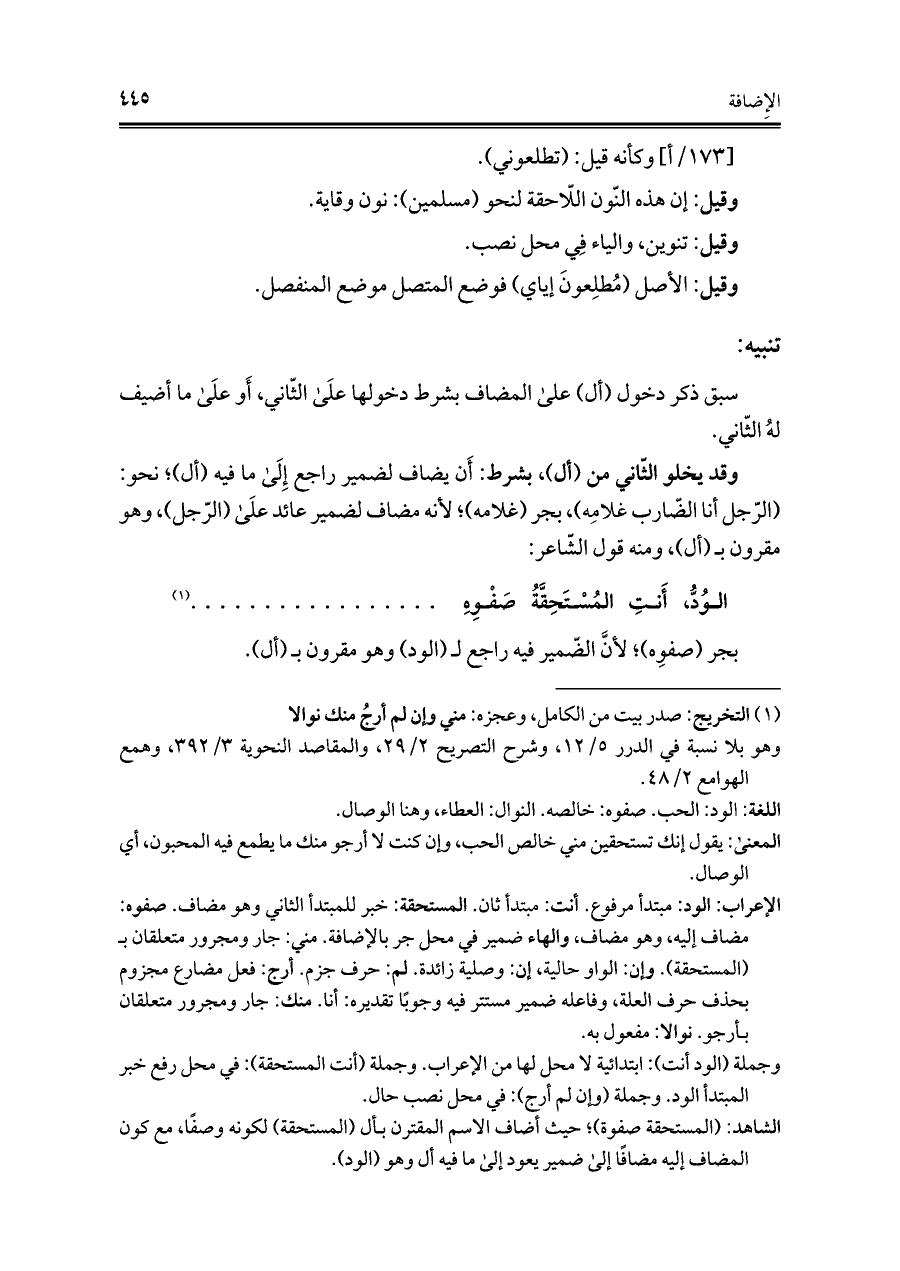 الشاهد: (المستحقة صفوة)؛ حيث أضاف الاسم المقترن بأل (المستحقة) لكونه وصفًا، مع كون المضاف إليه مضافًا إلى ضمير يعود إلى ما فيه أل وهو (الود).