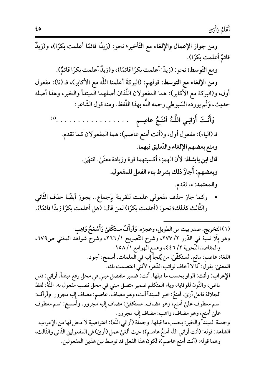 الشاهد: قوله: (أنت أراني الله أمنعُ عاصم)؛ حيث ألغى عمل (أرى) في المفعولين الثّاني والثّالث، وهما قوله: (أنت أمنع عاصم)؛ لكون هذا الفعل قد توسط بين هذين المفعولين.