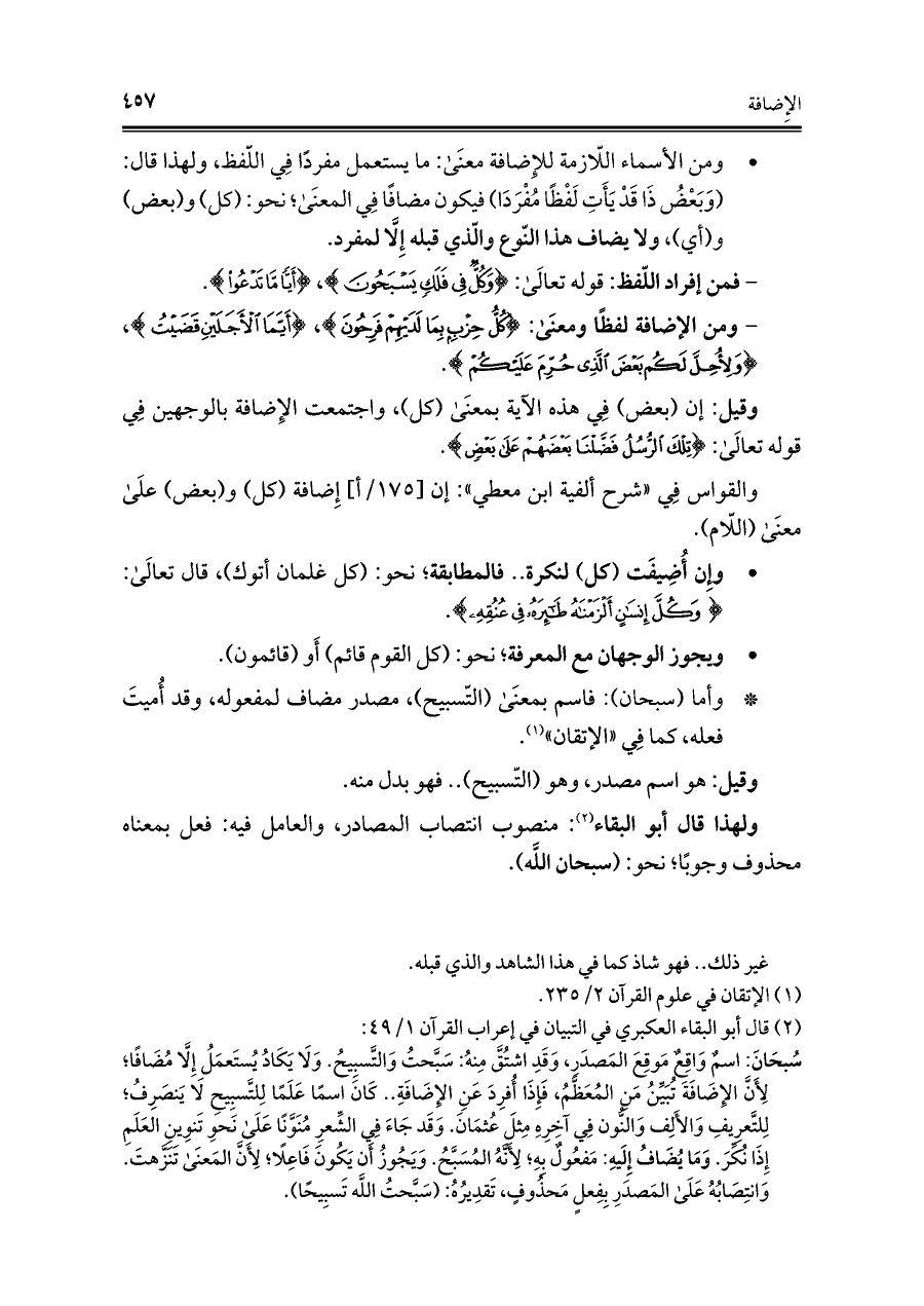 - ومن الإضافة لفظًا ومعنَى: {كُلُّ حِزْبٍ بِمَا لَدَيْهِمْ فَرِحُونَ}، {أَيَّمَا الْأَجَلَيْنِ قَضَيْتُ}، {وَلِأُحِلَّ لَكُمْ بَعْضَ الَّذِي حُرِّمَ عَلَيْكُمْ}.
