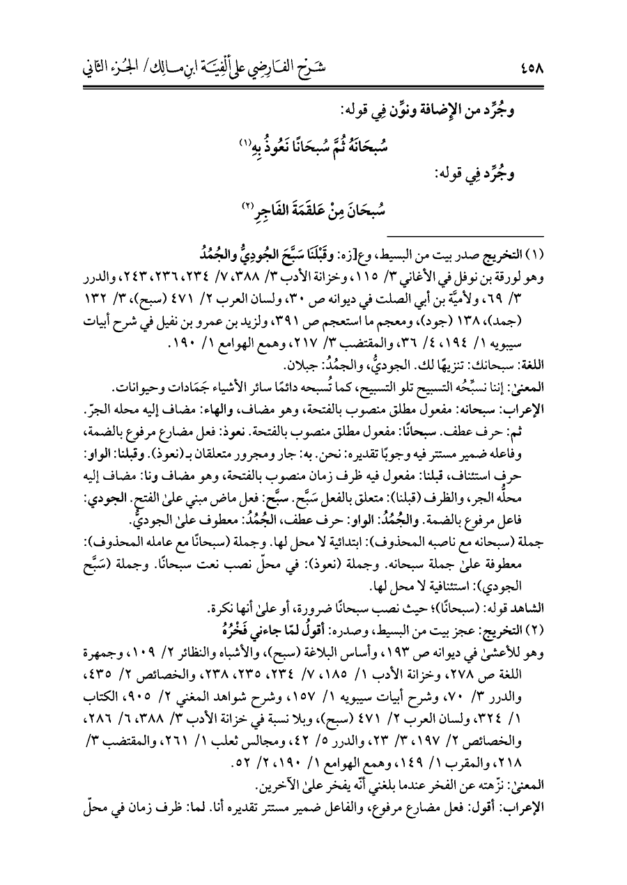 الشاهد قوله: (سبحانًا)؛ حيث نصب سبحانًا ضرورة، أو على أنها نكرة.