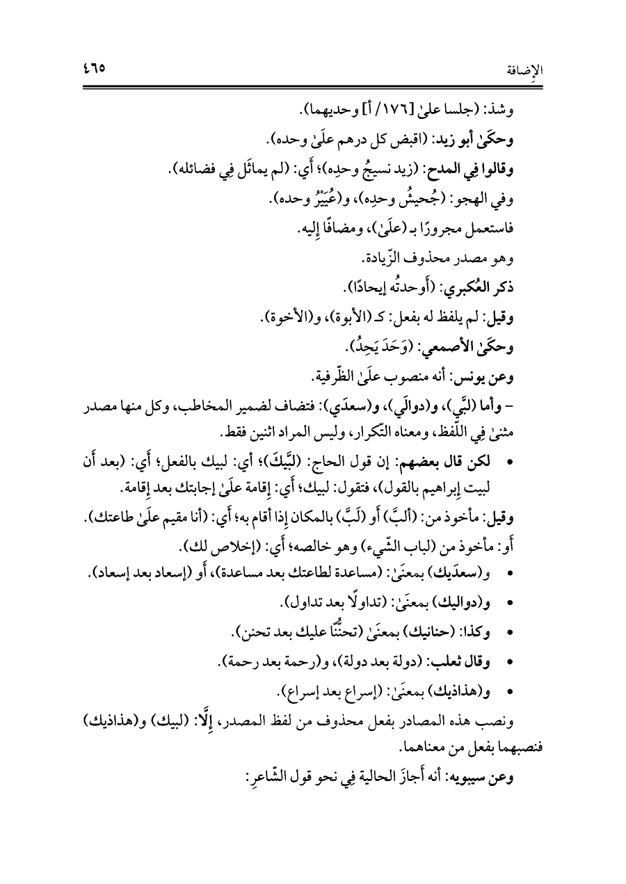 * ونصب هذه المصادر بفعل محذوف من لفظ المصدر, إِلَّا: (لبيك) و (هذاذيك) فنصبهما بفعل من معناهما.