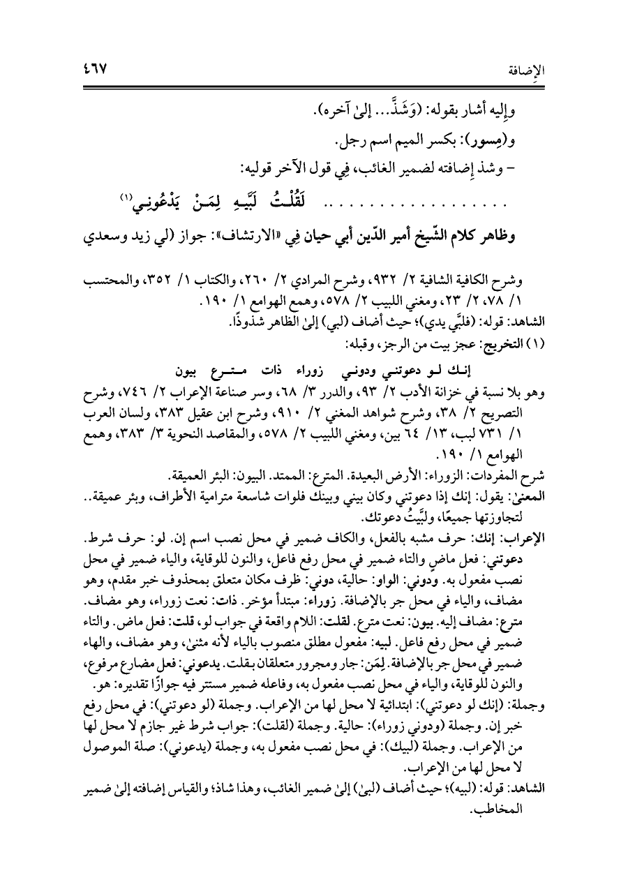 الشاهد: قوله: (فلبَّي يدي)؛ حيث أضاف (لبي) إلى الظاهر شذوذًا.