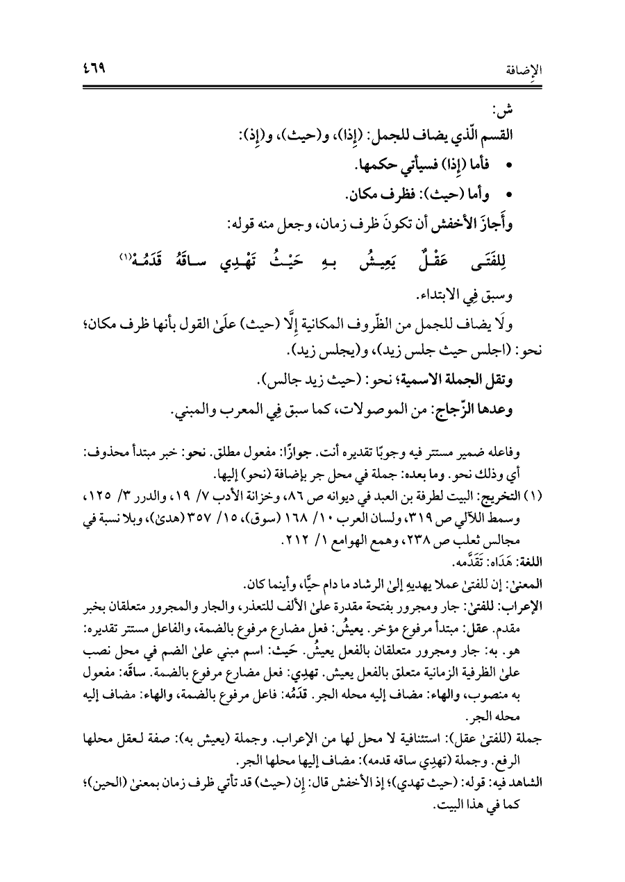 (١) التخريج: البيت لطرفة بن العبد في ديوانه ص ٨٦، وخزانة الأدب ٧/ ١٩، والدرر ٣/ ١٢٥، وسمط اللآلي ص ٣١٩، ولسان العرب ١٠/ ١٦٨ (سوق)، ١٥/ ٣٥٧ (هدى)، وبلا نسبة في مجالس ثعلب ص ٢٣٨، وهمع الهوامع ١/ ٢١٢.