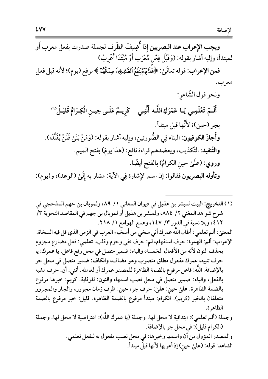 الإعراب: ألم: الهمزة: حرف استفهام، لم: حرف نفي وجزم وقلب. تعلمي: فعل مضارع مجزوم بحذف النون لأنه من الأفعال الخمسة، والياء: ضمير متصل في محل رفع فاعل. يا عمرك: يا حرف تنبيه، عمرك مفعول مطلق منصوب وهو مضاف، والكاف: ضمير متصل في محل جر بالإضافة. اللَّه: فاعل مرفوع بالضمة الظاهرة للمصدر عمرك أو لعامله. أنني. أن: حرف مشبه بالفعل، والياء: ضمير متصل في محل نصب اسمها، والنون: للوقاية. كريم: خبرها مرفوع بالضمة الظاهرة. على حينِ: على: حرف جر، حين: ظرف زمان مجرور، والجار والمجرور متعلقان بالخبر (كريم). الكرام: مبتدأ مرفوع بالضمة الظاهرة. قليل: خبر مرفوع بالضمة الظاهرة.