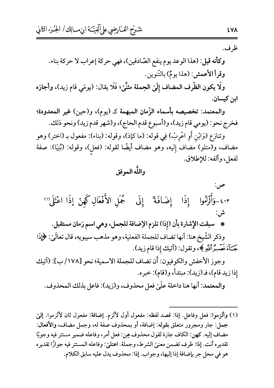 وذكر الشّيخ هنا: أنها تضاف للجملة الفعلية، وهو مذهب سيبويه، قال تعالَى: {إِذَا جَاءَ نَصْرُ اللَّهِ}، وتقول: (آتيك إِذا قام زيد).