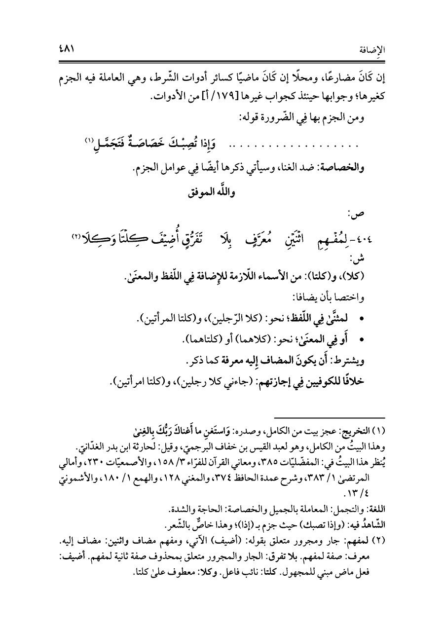معرف: صفة لمفهم. بلا تفرق: الجار والمجرور متعلق بمحذوف صفة ثانية لمفهم. أضيف: فعل ماض مبني للمجهول. كلتا: نائب فاعل. وكلا: معطوف على كلتا.