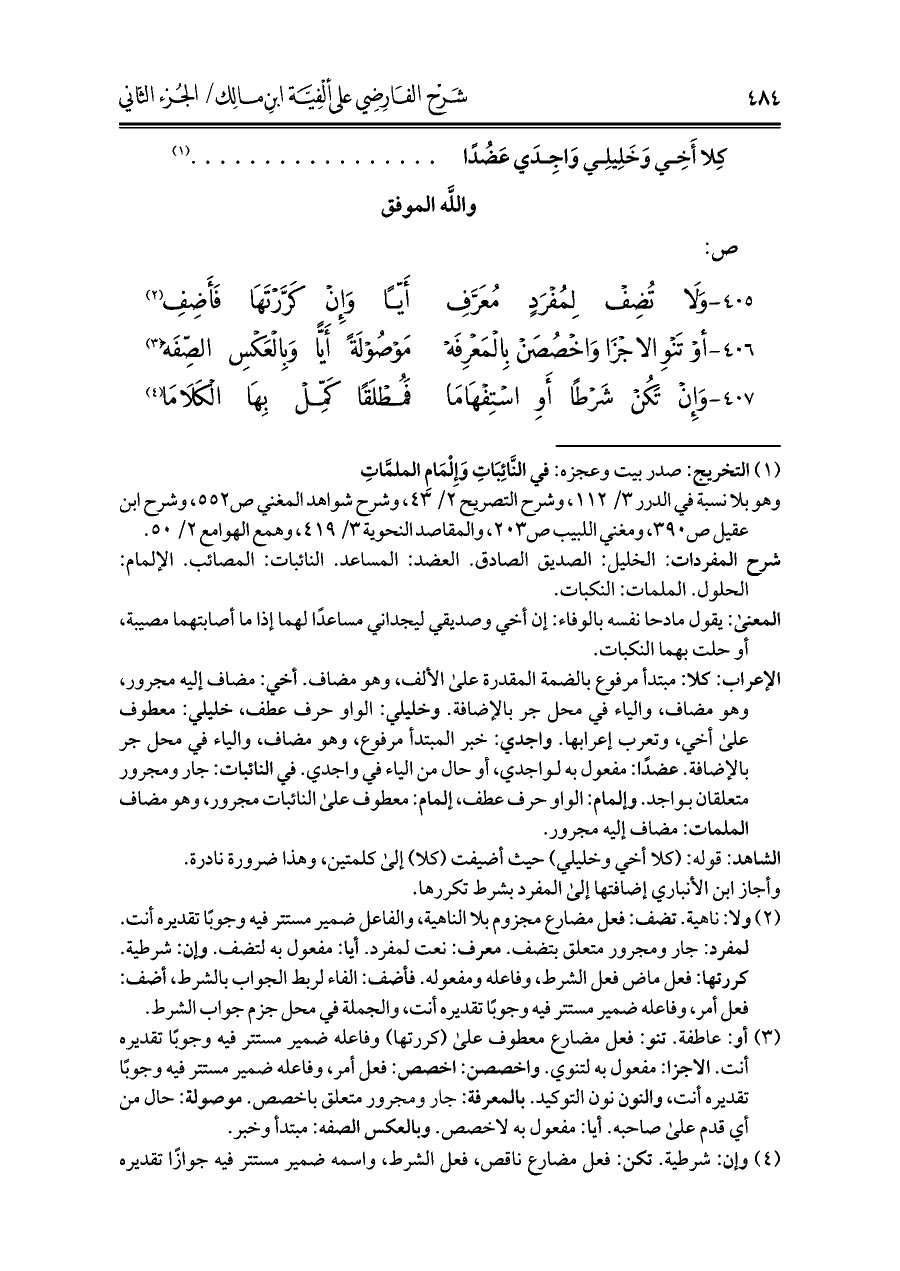 الإعراب: كلا: مبتدأ مرفوع بالضمة المقدرة على الألف، وهو مضاف. أخي: مضاف إليه مجرور، وهو مضاف، والياء في محل جر بالإضافة. وخليلي: الواو حرف عطف، خليلي: معطوف على أخي، وتعرب إعرابها. واجدي: خبر المبتدأ مرفوع، وهو مضاف، والياء في محل جر بالإضافة. عضدًا: مفعول به لواجدي، أو حال من الياء في واجدي. في النائبات: جار ومجرور متعلقان بواجد. وإلمام: الواو حرف عطف، إلمام: معطوف على النائبات مجرور، وهو مضاف الملمات: مضاف إليه مجرور.