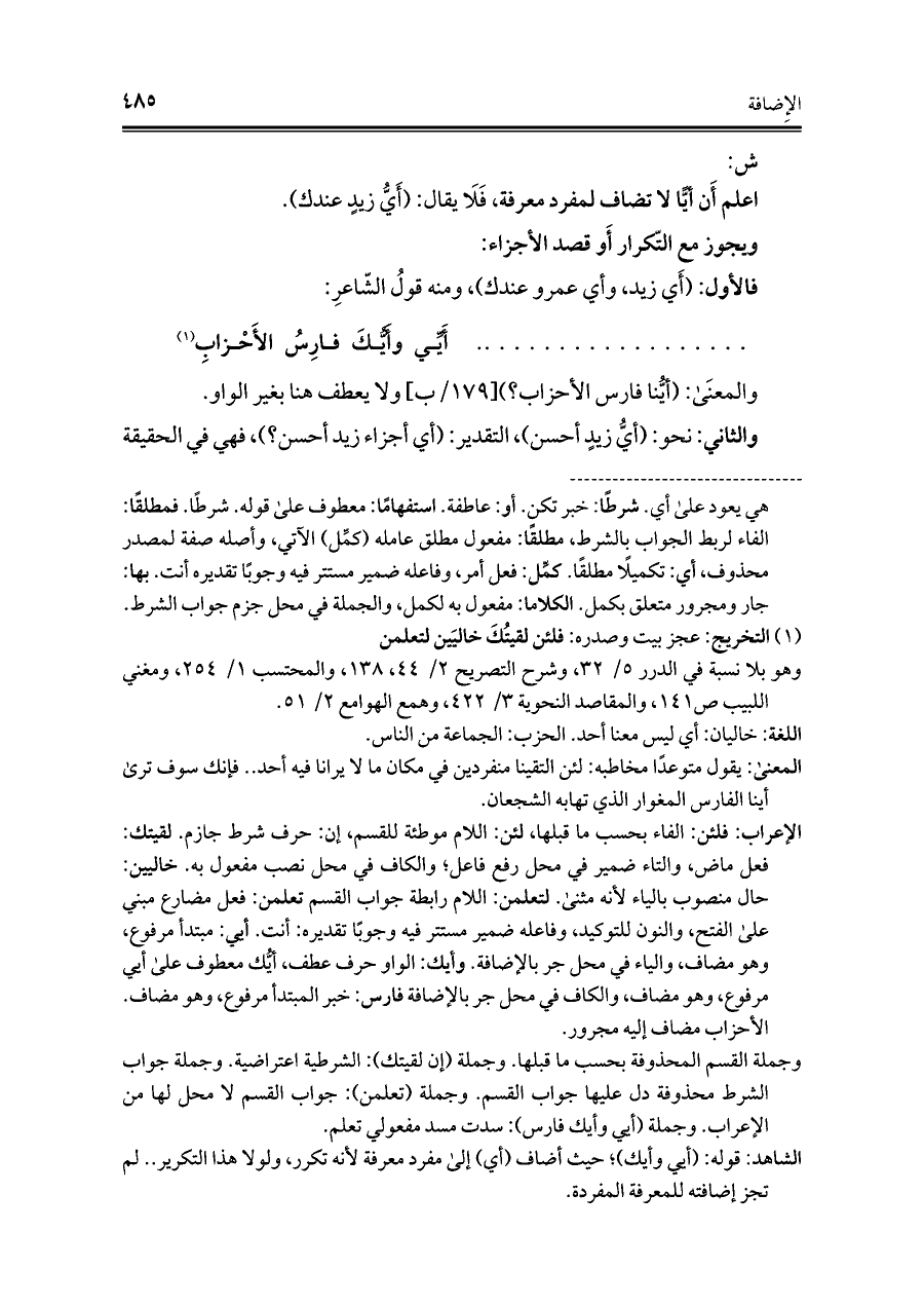 الشاهد: قوله: (أيي وأيك)؛ حيث أضاف (أي) إلى مفرد معرفة لأنه تكرر، ولولا هذا التكرير .. لم تجز إضافته للمعرفة المفردة.