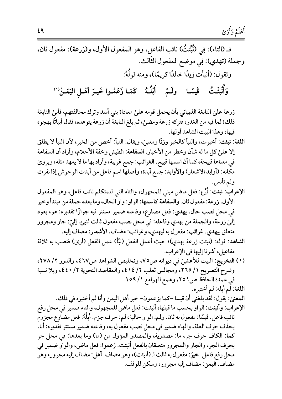 الشاهد: قوله: (نبئت زرعة يهدي)؛ حيث أعمل الفعل (نبّأ) عمل الفعل (أرى) فنصب به ثلاثة مفاعيل، أشرنا إليها في الإعراب.
