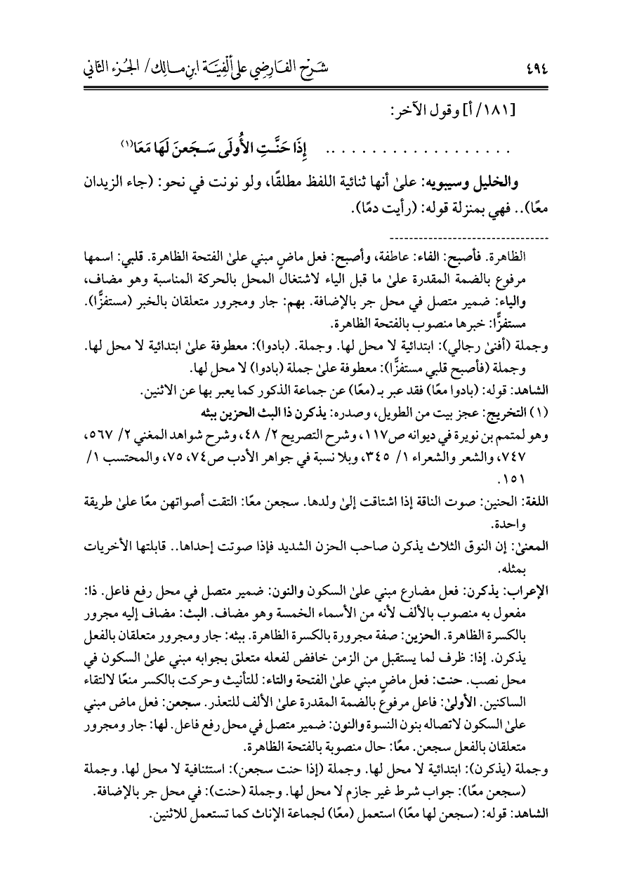 الإعراب: يذكرن: فعل مضارع مبني على السكون والنون: ضمير متصل في محل رفع فاعل. ذا: مفعول به منصوب بالألف لأنه من الأسماء الخمسة وهو مضاف. البث: مضاف إليه مجرور بالكسرة الظاهرة. الحزين: صفة مجرورة بالكسرة الظاهرة. ببثه: جار ومجرور متعلقان بالفعل يذكرن. إذا: ظرف لما يستقبل من الزمن خافض لفعله متعلق بجوابه مبني على السكون في محل نصب. حنت: فعل ماضٍ مبني على الفتحة والتاء: للتأنيث وحركت بالكسر منعًا لالتقاء الساكنين. الأولى: فاعل مرفوع بالضمة المقدرة على الألف للتعذر. سجعن: فعل ماض مبني على السكون لاتصاله بنون النسوة والنون: ضمير متصل في محل رفع فاعل. لها: جار ومجرور متعلقان بالفعل سجعن. معًا: حال منصوبة بالفتحة الظاهرة.