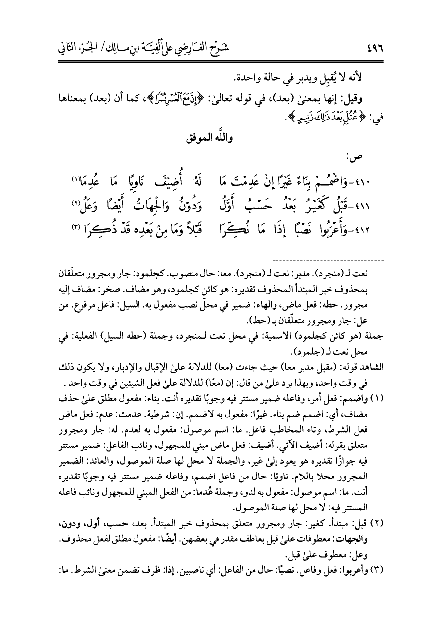 ٤١٠ - وَاضْمُمْ بِنَاءً غَيْرًا إنْ عَدِمْتَ مَا ... لَهُ أُضِيْفَ نَاوِيًا مَا عُدِمَا (¬١)