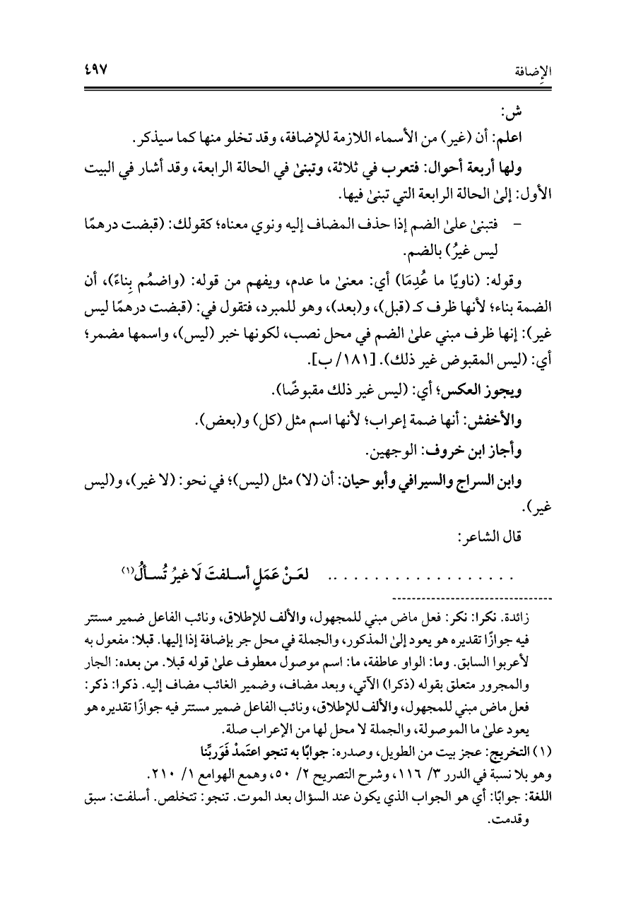 وقوله: (ناويًا ما عُدِمَا) أي: معنى ما عدم، ويفهم من قوله: (واضمُم بِناءً)، أن الضمة بناء؛ لأنها ظرف كـ (قبل)، و (بعد)، وهو للمبرد، فتقول في: (قبضت درهمًا ليس غير): إنها ظرف مبني على الضم في محل نصب، لكونها خبر (ليس)، واسمها مضمر؛ أي: (ليس المقبوض غير ذلك).