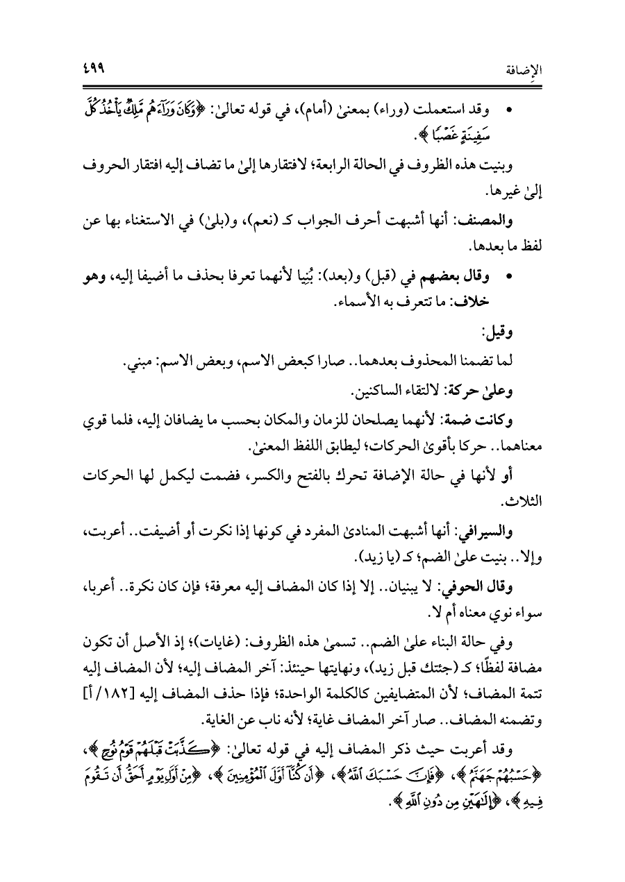 وقد أعربت حيث ذكر المضاف إليه في قوله تعالى: {كَذَّبَتْ قَبْلَهُمْ قَوْمُ نُوحٍ}، {حَسْبُهُمْ جَهَنَّمُ}، {فَإِنَّ حَسْبَكَ اللَّهُ}، {أَنْ كُنَّا أَوَّلَ الْمُؤْمِنِينَ}، {مِنْ أَوَّلِ يَوْمٍ أَحَقُّ أَنْ تَقُومَ فِيهِ}، {إِلَهَيْنِ مِنْ دُونِ اللَّهِ}.