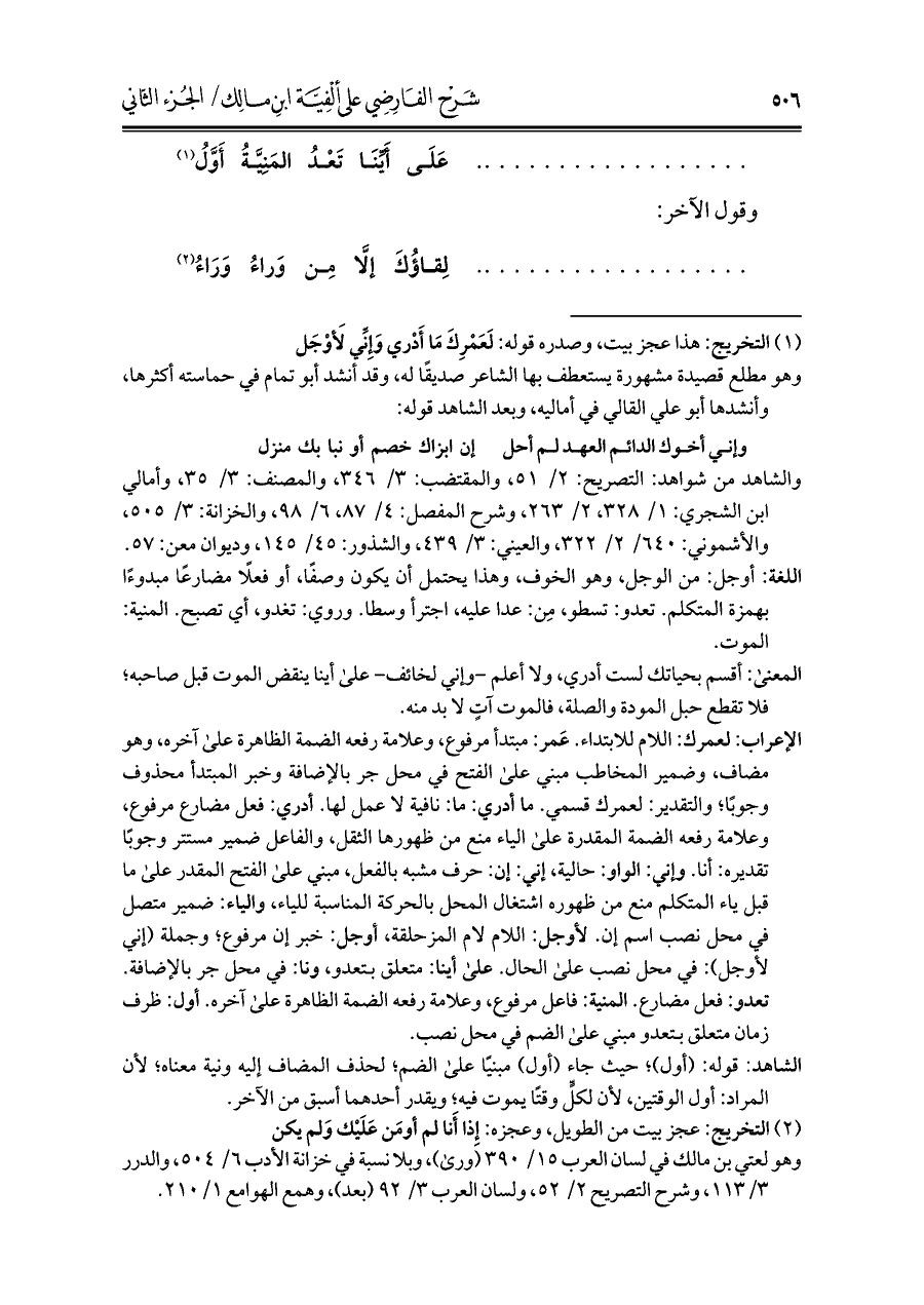 الإعراب: لعمرك: اللام للابتداء. عَمر: مبتدأ مرفوع، وعلامة رفعه الضمة الظاهرة على آخره، وهو مضاف، وضمير المخاطب مبني على الفتح في محل جر بالإضافة وخبر المبتدأ محذوف وجوبًا؛ والتقدير: لعمرك قسمي. ما أدري: ما: نافية لا عمل لها. أدري: فعل مضارع مرفوع، وعلامة رفعه الضمة المقدرة على الياء منع من ظهورها الثقل، والفاعل ضمير مستتر وجوبًا تقديره: أنا. وإني: الواو: حالية، إني: إن: حرف مشبه بالفعل، مبني على الفتح المقدر على ما قبل ياء المتكلم منع من ظهوره اشتغال المحل بالحركة المناسبة للياء، والياء: ضمير متصل في محل نصب اسم إن. لأوجل: اللام لام المزحلقة، أوجل: خبر إن مرفوع؛ وجملة (إني لأوجل): في محل نصب على الحال. على أينا: متعلق بتعدو، ونا: في محل جر بالإضافة. تعدو: فعل مضارع. المنية: فاعل مرفوع، وعلامة رفعه الضمة الظاهرة على آخره. أول: ظرف زمان متعلق بتعدو مبني على الضم في محل نصب.
