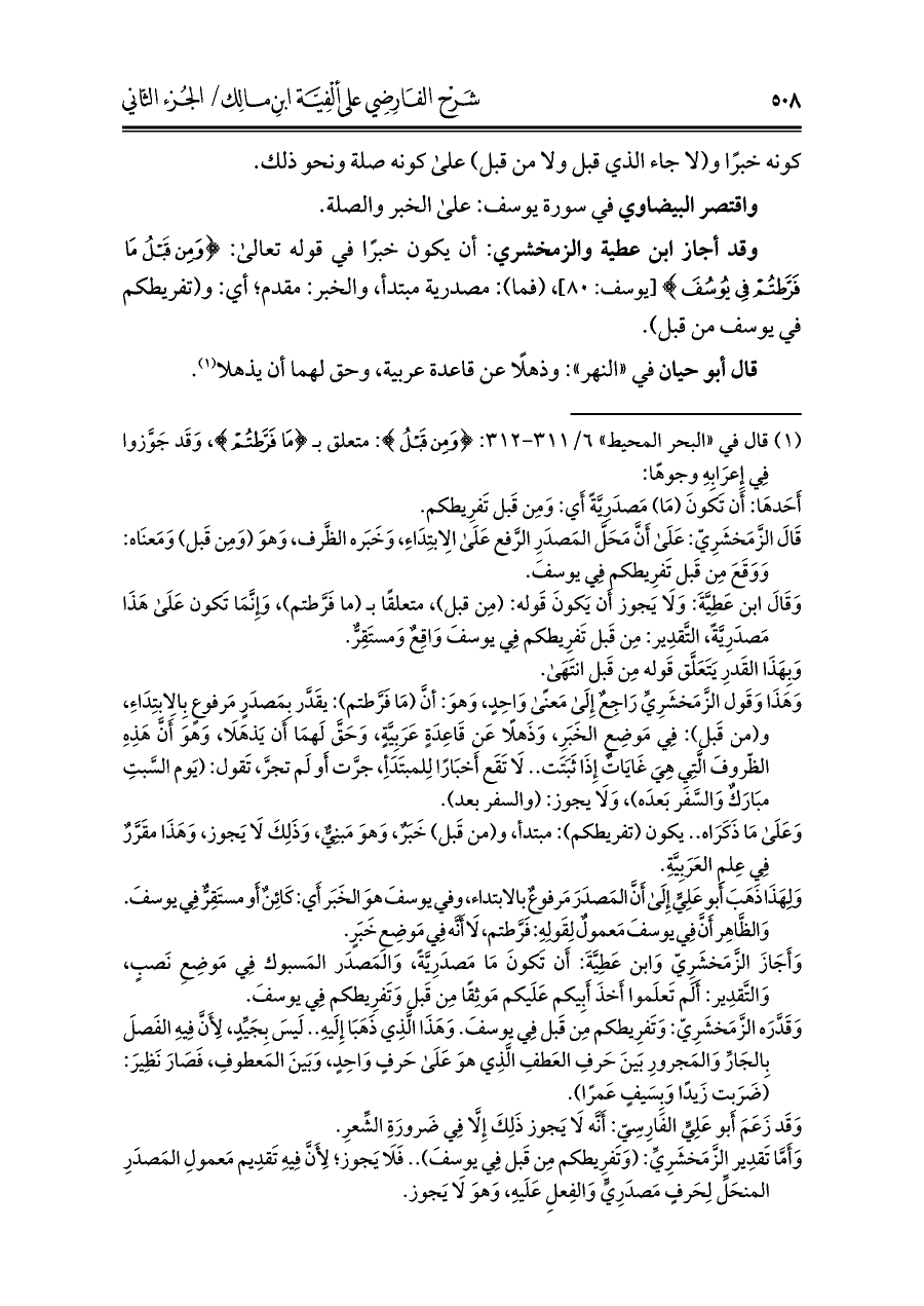 وَهَذَا وَقَول الزَّمَخشَرِيِّ رَاجِعٌ إِلَى مَعنَى وَاحِدٍ، وَهوَ: أنَّ (مَا فَرَّطتم): يقَدَّر بِمَصدَرٍ مَرفوعٍ بالِابتِدَاءِ، و (من قَبل): فِي مَوضِع الَخَبَرِ، وَذَهلًا عَن قَاعِدَةٍ عَرَبِيَّةٍ، وَحَقَّ لَهمَا أَن يَذهَلَا، وَهَوَ أَنَّ هَذِهِ الظّروفَ الَّتِي هِيَ غَايَاتٌ إِذَا ثَبَتَت .. لَا تَقَع أَخبَارًا لِلمبتَدَأِ، جرَّت أَو لَم تجرَّ، تَقول: (يَوم السَّبتِ مبَارَكٌ وَالسَّفَر بَعدَه)، وَلَا يجوز: (والسفر بعد).
