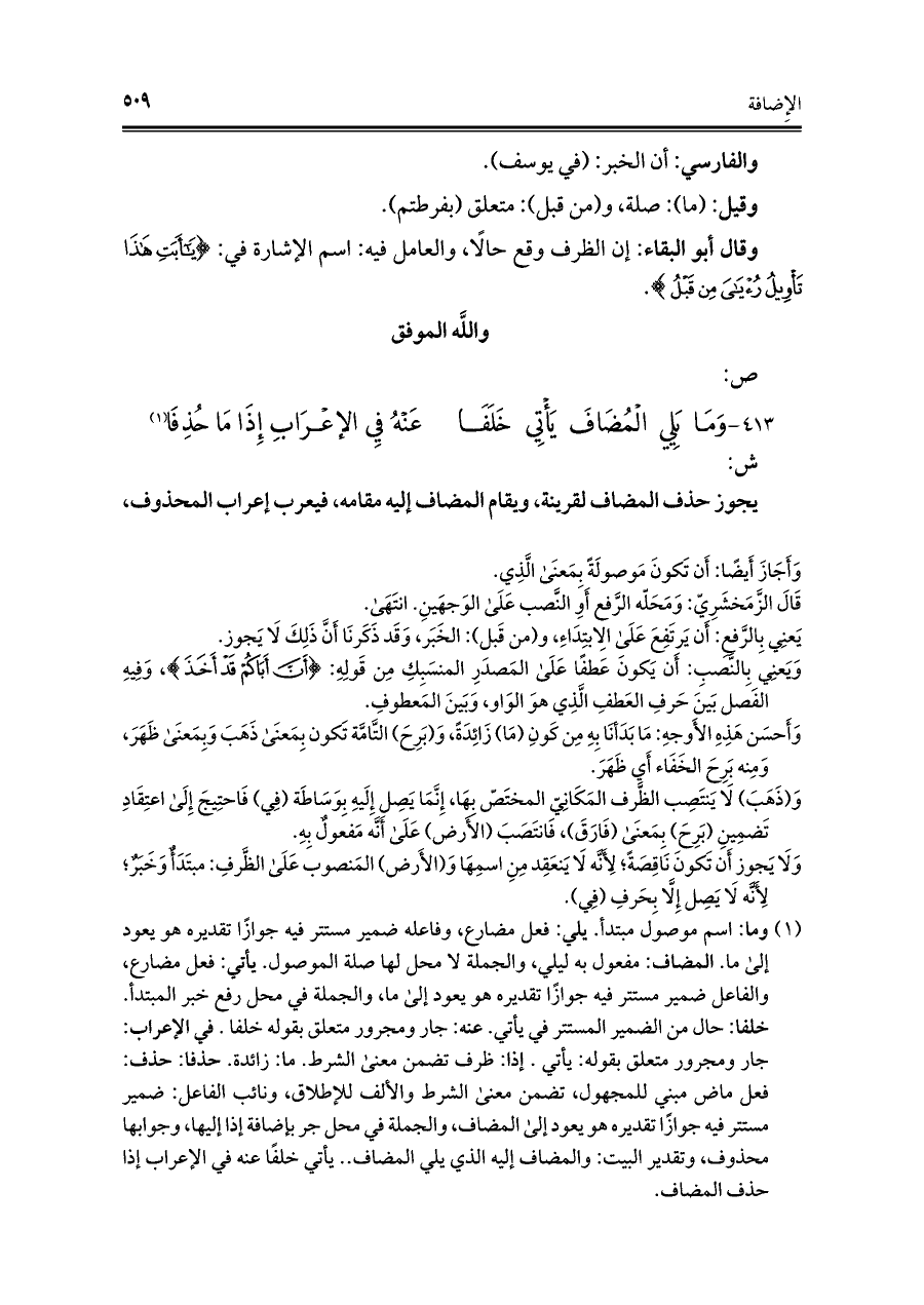 (¬١) وما: اسم موصول مبتدأ. يلي: فعل مضارع، وفاعله ضمير مستتر فيه جوازًا تقديره هو يعود إلى ما. المضاف: مفعول به ليلي، والجملة لا محل لها صلة الموصول. يأتي: فعل مضارع، والفاعل ضمير مستتر فيه جوازًا تقديره هو يعود إلى ما، والجملة في محل رفع خبر المبتدأ. خلفا: حال من الضمير المستتر في يأتي. عنه: جار ومجرور متعلق بقوله خلفا. في الإعراب: جار ومجرور متعلق بقوله: يأتي. إذا: ظرف تضمن معنى الشرط. ما: زائدة. حذفا. حذف: فعل ماض مبني للمجهول، تضمن معنى الشرط والألف للإطلاق، ونائب الفاعل: ضمير مستتر فيه جوازًا تقديره هو يعود إلى المضاف، والجملة في محل جر بإضافة إذا إليها، وجوابها محذوف، وتقدير البيت: والمضاف إليه الذي يلي المضاف .. يأتي خلفًا عنه في الإعراب إذا حذف المضاف.