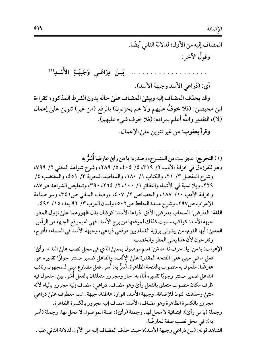 الإعراب: يا من: يا: حرف نداء، مَن: اسم موصول بمعنى الذي في محل نصب على النداء. رأى: فعل ماضٍ مبني على الفتحة المقدرة على الألف، والفاعل ضمير مستتر جوازًا تقديره هو. عارضًا: مفعول به منصوب بالفتحة الظاهرة. أُسرُّ به: أُسر: فعل مضارع مبني للمجهول ونائب الفاعل ضمير مستتر وجوبًا تقديره أنا، به: جار ومجرور متعلقان بالفعل أُسَر. بين: مفعول فيه ظرف مكان منصوب متعلق بالفعل رأى وهو مضاف. ذراعي: مضاف إليه مجرور بالياء لأنه مثنى وحذفت النون للإضافة. وجبهة الأسد: الواو: عاطفة, جبهة: اسم معطوف على ذراعي مجرور بالكسرة الظاهرة وهو مضاف, الأسد: مضاف إليه مجرور بالكسرة الظاهرة.