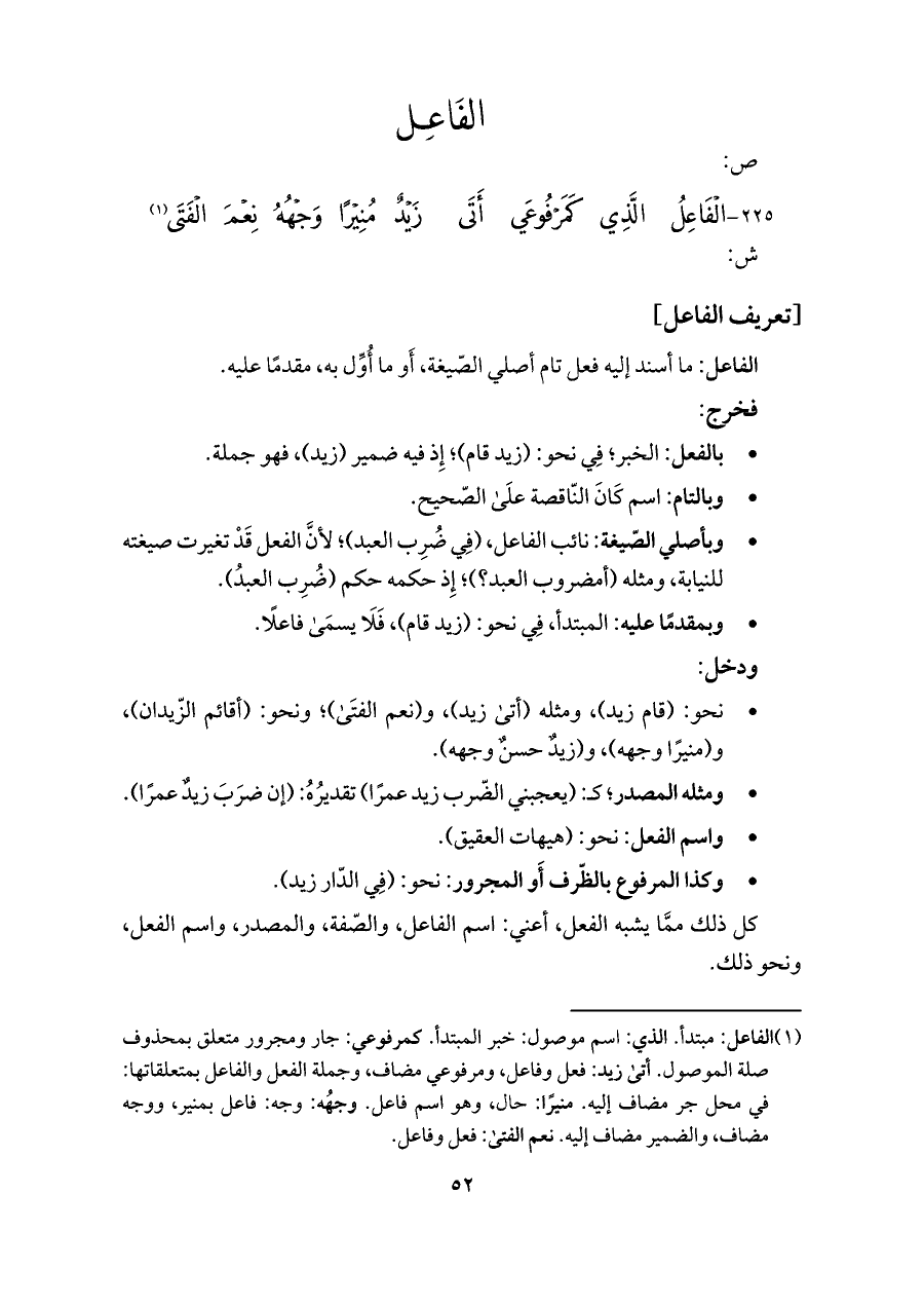 ٢٢٥ - الْفَاعِلُ الَّذِي كَمَرْفُوعَي أَتَى ... زَيْدٌ مُنِيْرًا وَجْهُهُ نِعْمَ الْفَتَى (¬١)