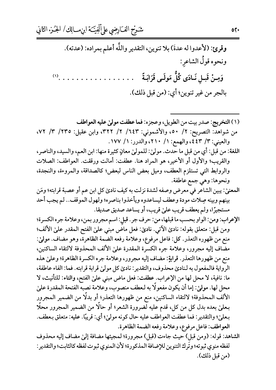 الإعراب: ومن: الواو بحسب ما قبلها، من: حرف جر. قبلِ: اسم مجرور بمن، وعلامة جره الكسرة؛ ومن قبل: متعلق بقوله: نادى الآتي. نادى: فعل ماض مبني على الفتح المقدر على الألف؛ منع من ظهوره التعذر. كل: فاعل مرفوع، وعلامة رفعه الضمة الظاهرة، وهو مضاف. مولى: مضاف إليه مجرور، وعلامة جره الكسرة المقدرة على الألف المحذوفة لالتقاء الساكنين، منع من ظهورها التعذر. قرابةٍ: مضاف إليه مجرور، وعلامة جره الكسرة الظاهرة؛ وعلى هذه الرواية فالمفعول به لنادى محذوف، والتقدير: نادى كل مولى قرابة قرابته. فما: الفاء عاطفة، ما: نافية، لا محل لها من الإعراب. عطفت: فعل ماض مبني على الفتح، والتاء: للتأنيث، لا محل لها. مولى: إما أن يكون مفعولًا به لعطف منصوب، وعلامة نصبه الفتحة المقدرة على الألف المحذوفة؛ لالتقاء الساكنين، منع من ظهورها التعذر؛ أو بدلًا من الضمير المجرور بعلى بعده بدل كل من كل، قدم عليه لضرورة الشعر؛ أو حالًا من الضمير المجرور محلًا بعلى؛ والتقدير: فما عطفت العواطف عليه حال كونه مولى؛ أي: قريبًا. عليه: متعلق بعطف. العواطف: فاعل مرفوع، وعلامة رفعه الضمة الظاهرة.