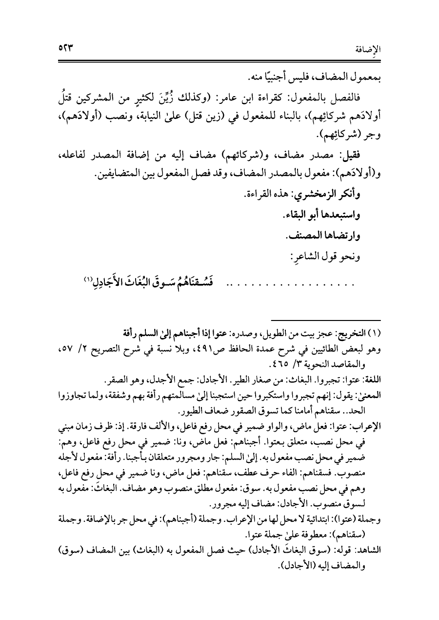 الشاهد: قوله: (سوق البغاثَ الأجادل) حيث فصل المفعول به (البغاث) بين المضاف (سوق) والمضاف إليه (الأجادل).