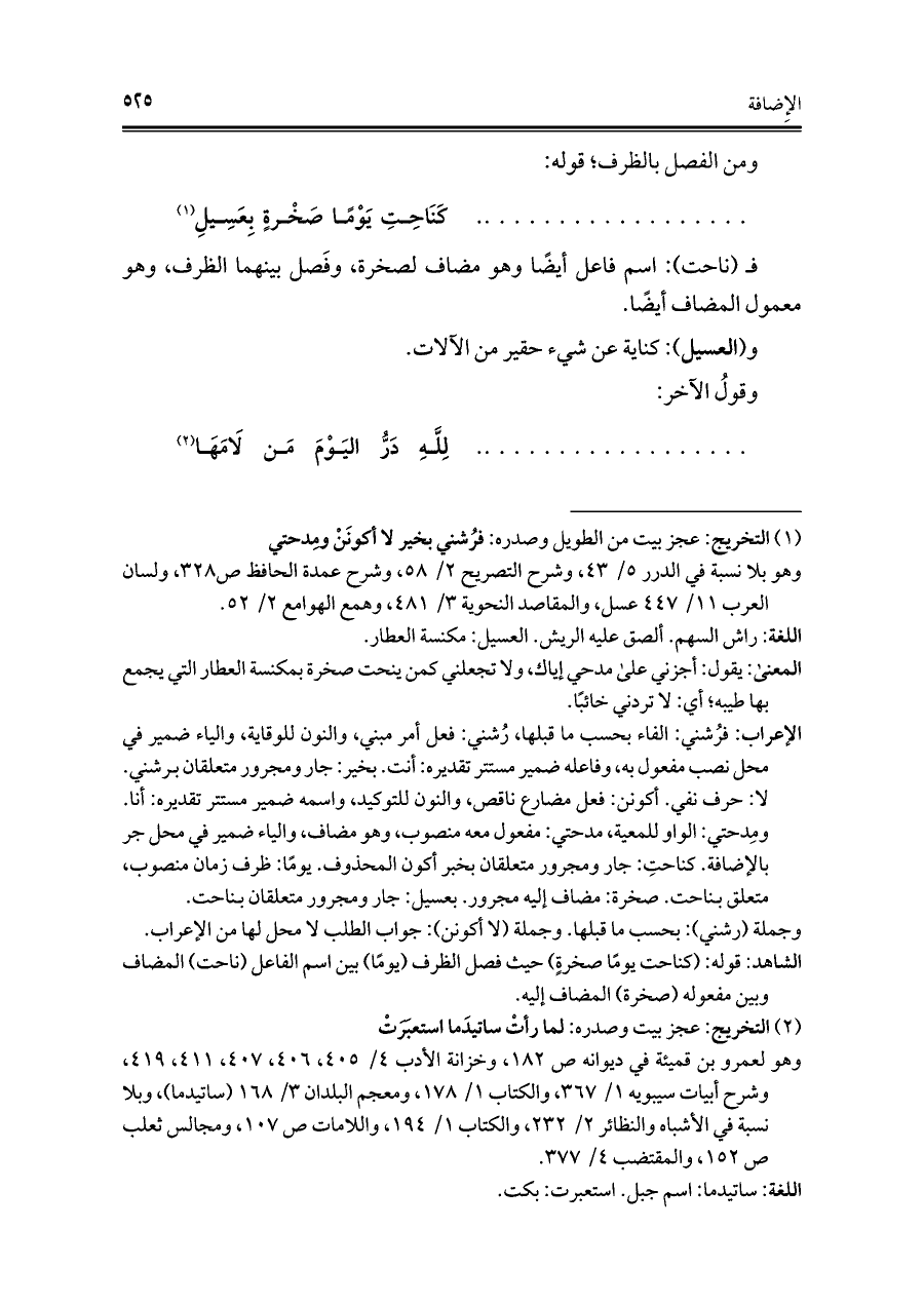 الشاهد: قوله: (كناحت يومًا صخرةٍ) حيث فصل الظرف (يومًا) بين اسم الفاعل (ناحت) المضاف وبين مفعوله (صخرة) المضاف إليه.