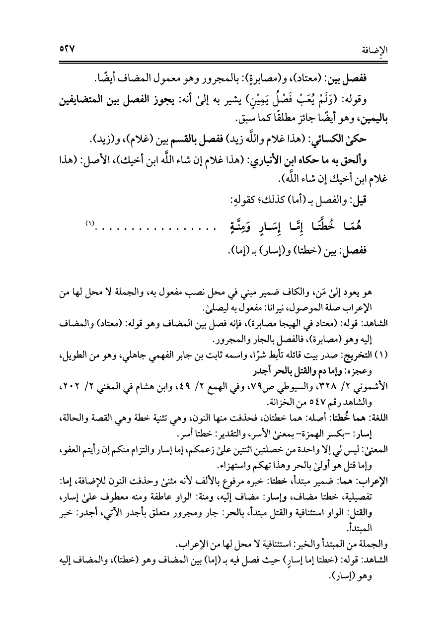 الشاهد: قوله: (خطتا إما إسارٍ) حيث فصل فيه بـ (إما) بين المضاف وهو (خطتا)، والمضاف إليه وهو (إسار).