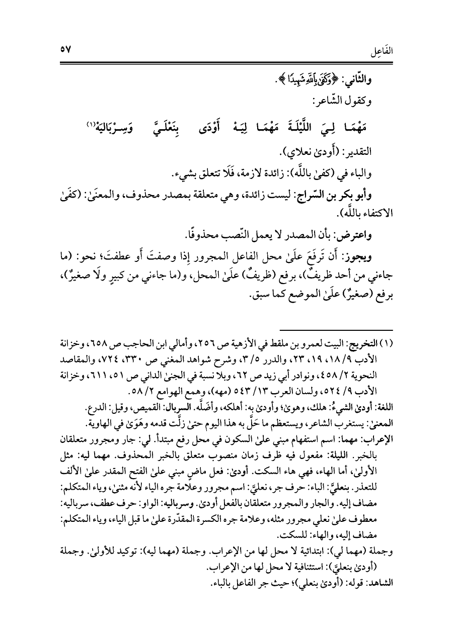 الشاهد: قوله: (أودى بنعلي)؛ حيث جر الفاعل بالباء.