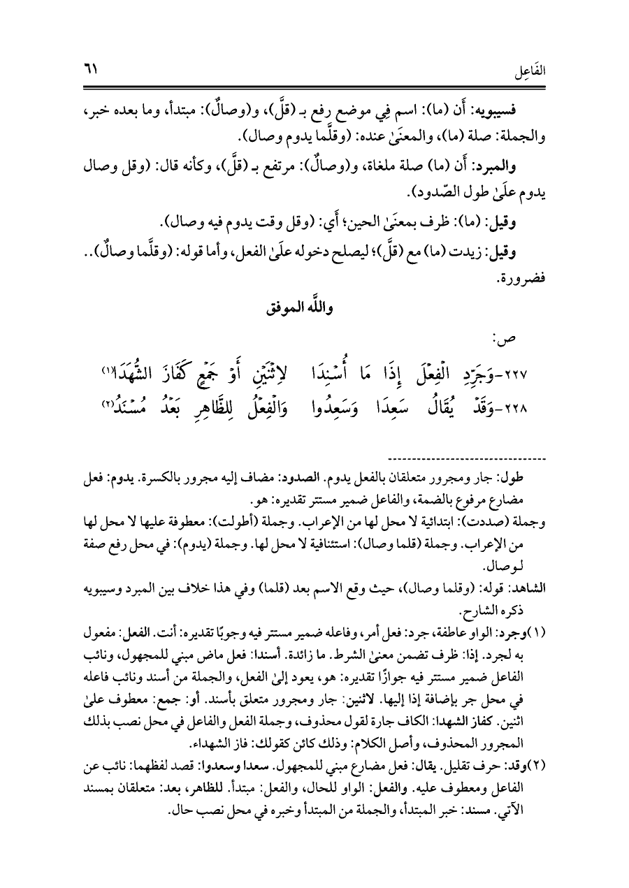 (¬١) وجرد: الواو عاطفة، جرد: فعل أمر، وفاعله ضمير مستتر فيه وجوبًا تقديره: أنت. الفعل: مفعول به لجرد. إذا: ظرف تضمن معنى الشرط. ما زائدة. أسندا: فعل ماض مبني للمجهول، ونائب الفاعل ضمير مستتر فيه جوازًا تقديره: هو، يعود إلى الفعل، والجملة من أسند ونائب فاعله في محل جر بإضافة إذا إليها. لاثنين: جار ومجرور متعلق بأسند. أو: جمع: معطوف على اثنين. كفاز الشهدا: الكاف جارة لقول محذوف، وجملة الفعل والفاعل في محل نصب بذلك المجرور المحذوف، وأصل الكلام: وذلك كائن كقولك: فاز الشهداء.