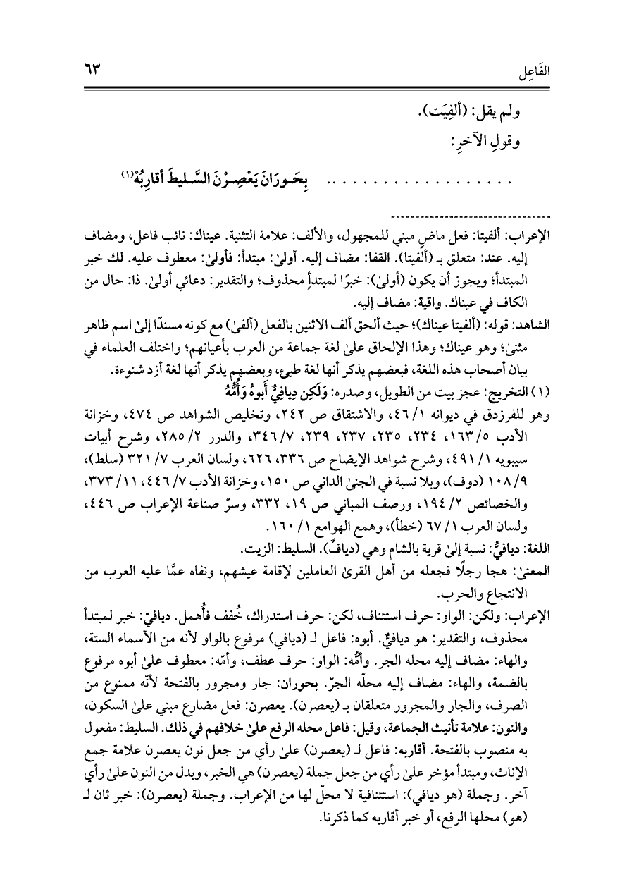 الشاهد: قوله: (ألفيتا عيناك)؛ حيث ألحق ألف الاثنين بالفعل (ألفى) مع كونه مسندًا إلى اسم ظاهر مثنى؛ وهو عيناك؛ وهذا الإلحاق على لغة جماعة من العرب بأعيانهم؛ واختلف العلماء في بيان أصحاب هذه اللغة، فبعضهم يذكر أنها لغة طيئ، وبعضهم يذكر أنها لغة أزد شنوءة.