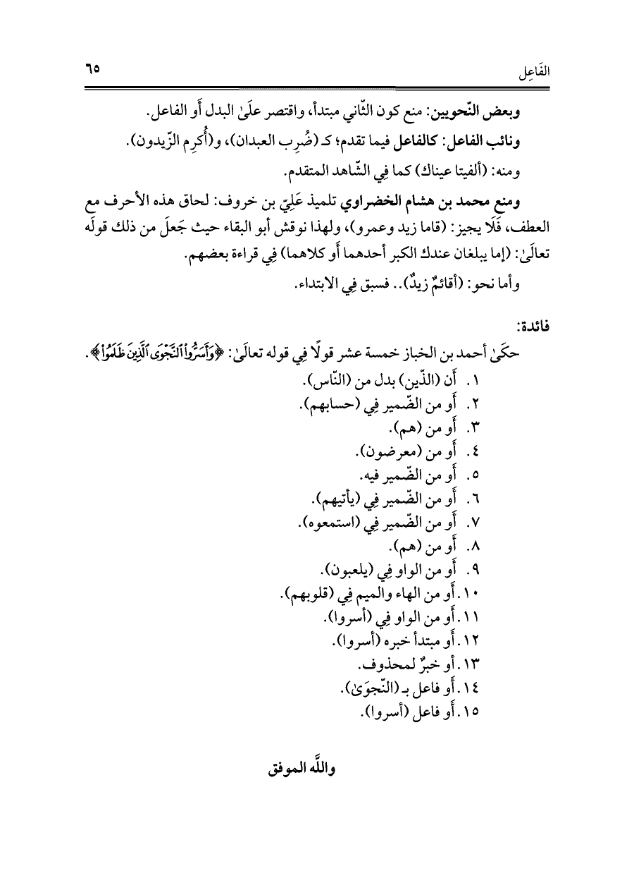 وبعض النّحويين: منع كون الثّاني مبتدأ، واقتصر علَى البدل أَو الفاعل.
