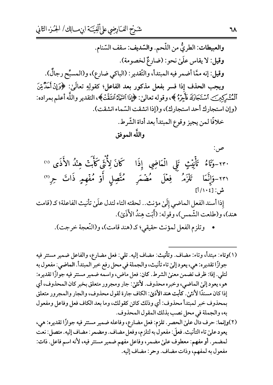 (¬١) وتاء: مبتدأ، وتاء: مضاف. وتأنيث: مضاف إليه. تلي: فعل مضارع، والفاعل ضمير مستتر فيه جوازًا تقديره: هي، يعود إلى تاء تأنيث، والجملة في محل رفع خبر المبتدأ. الماضي: مفعول به لتلي. إذا: ظرف تضمن معنى الشرط. كان: فعل ماض، واسمه ضمير مستتر فيه جوازًا تقديره: هو، يعود إلى الماضي، وخبره محذوف. لأنثى: جار ومجرور متعلق بخبر كان المحذوف، أي إذا كان مسندًا لأنثى. كأبت هند الأذى: الكاف جارة لقول محذوف، والجار والمجرور متعلق بمحذوف خبر لمبتدأ محذوف: أي وذلك كائن كقولك، وما بعد الكاف فعل وفاعل ومفعول به، والجملة في محل نصب بذلك المقول المحذوف.