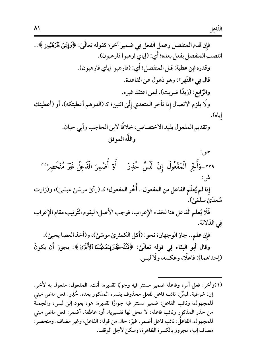 (¬١) وأخر: فعل أمر، وفاعله ضمير مستتر فيه وجوبًا تقديره: أنت. المفعول: مفعول به لأخر. إن: شرطية. لبسٌ: نائب فاعل لفعل محذوف يفسره المذكور بعده. حُذِر: فعل ماض مبني للمجهول، ونائب الفاعل: ضمير مستتر فيه جوازًا تقديره: هو، يعود إلى لبس، والجملة من حذر المذكور ونائب فاعله: لا محل لها تفسيرية. أو: عاطفة. أضمر: فعل ماض مبني للمجهول. الفاعل: نائب فاعل أضمر. غير: حال من قوله: الفاعل، وغير مضاف. ومنحصر: مضاف إليه، مجرور بالكسرة الظاهرة، وسكن لأجل الوقف.
