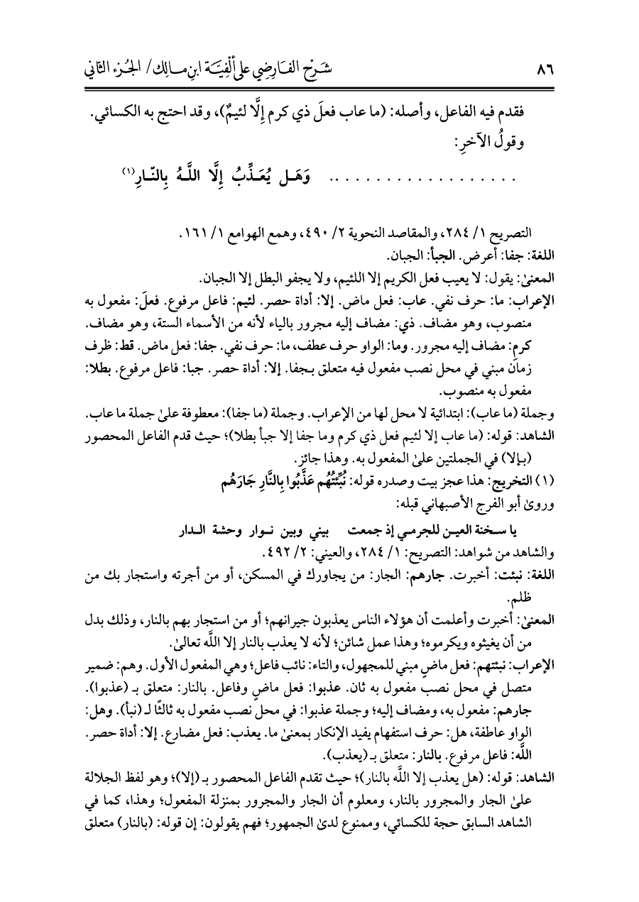 الشاهد: قوله: (هل يعذب إلا اللَّه بالنار)؛ حيث تقدم الفاعل المحصور بـ (إلا)؛ وهو لفظ الجلالة علي الجار والمجرور بالنار، ومعلوم أن الجار والمجرور بمنزلة المفعول؛ وهذا، كما في الشاهد السابق حجة للكسائي، وممنوع لدى الجمهور؛ فهم يقولون: إن قوله: (بالنار) متعلق =