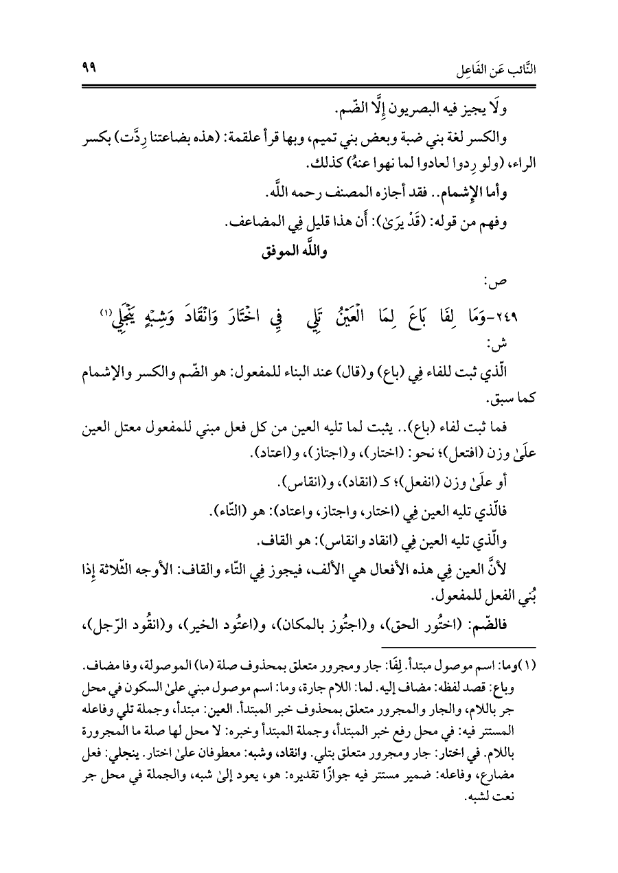 (¬١) وما: اسم موصول مبتدأ. لِفَا: جار ومجرور متعلق بمحذوف صلة (ما) الموصولة، وفا مضاف. وباع: قصد لفظه: مضاف إليه. لما: اللام جارة، وما: اسم موصول مبني على السكون في محل جر باللام، والجار والمجرور متعلق بمحذوف خبر المبتدأ. العين: مبتدأ، وجملة تلي وفاعله المستتر فيه: في محل رفع خبر المبتدأ، وجملة المبتدأ وخبره: لا محل لها صلة ما المجرورة باللام. في اختار: جار ومجرور متعلق بتلي. وانقاد, وشبه: معطوفان على اختار. ينجلي: فعل مضارع، وفاعله: ضمير مستتر فيه جوازًا تقديره: هو، يعود إلى شبه، والجملة في محل جر نعت لشبه.