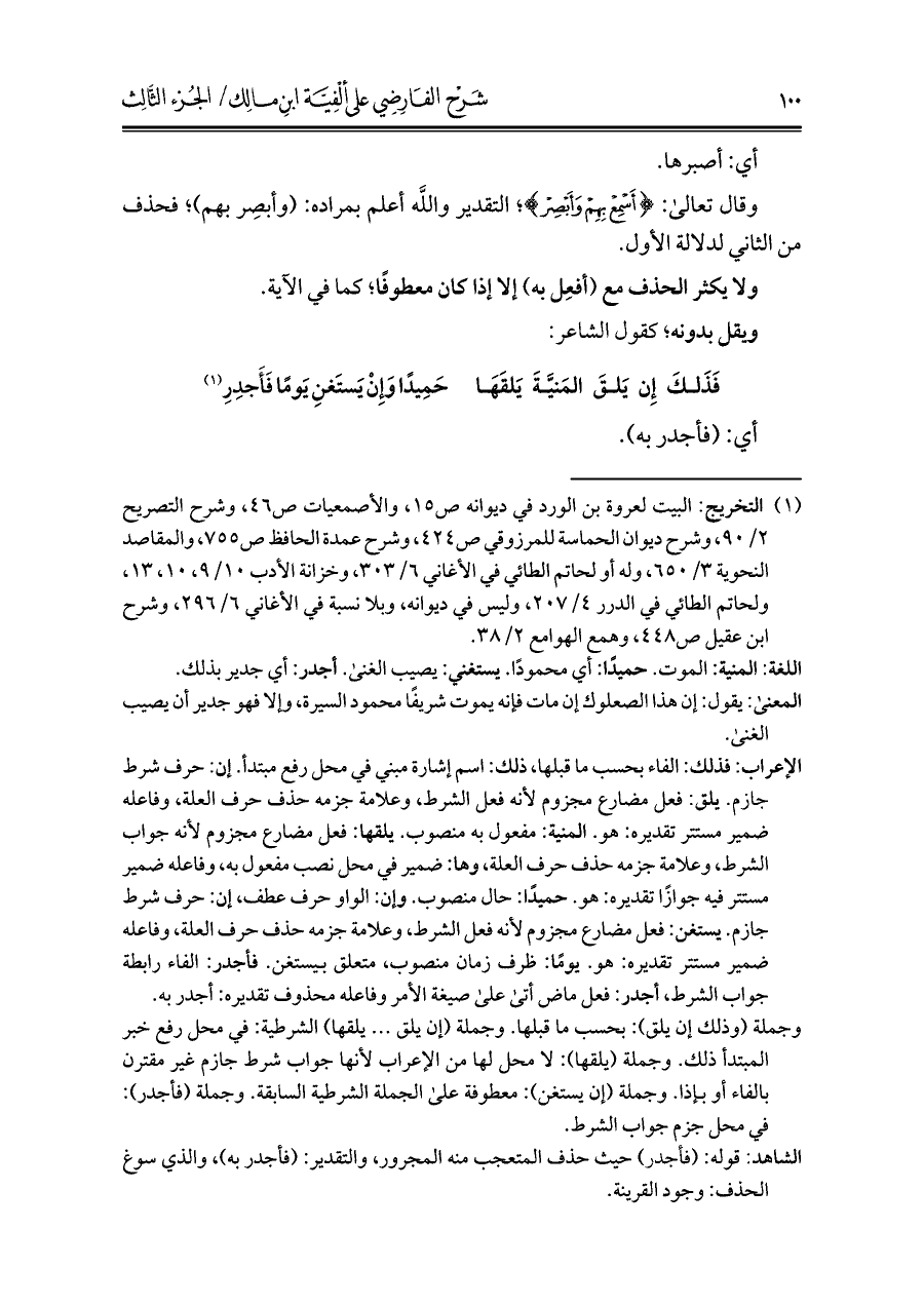 الشاهد: قوله: (فأجدر) حيث حذف المتعجب منه المجرور، والتقدير: (فأجدر به)، والذي سوغ الحذف: وجود القرينة.