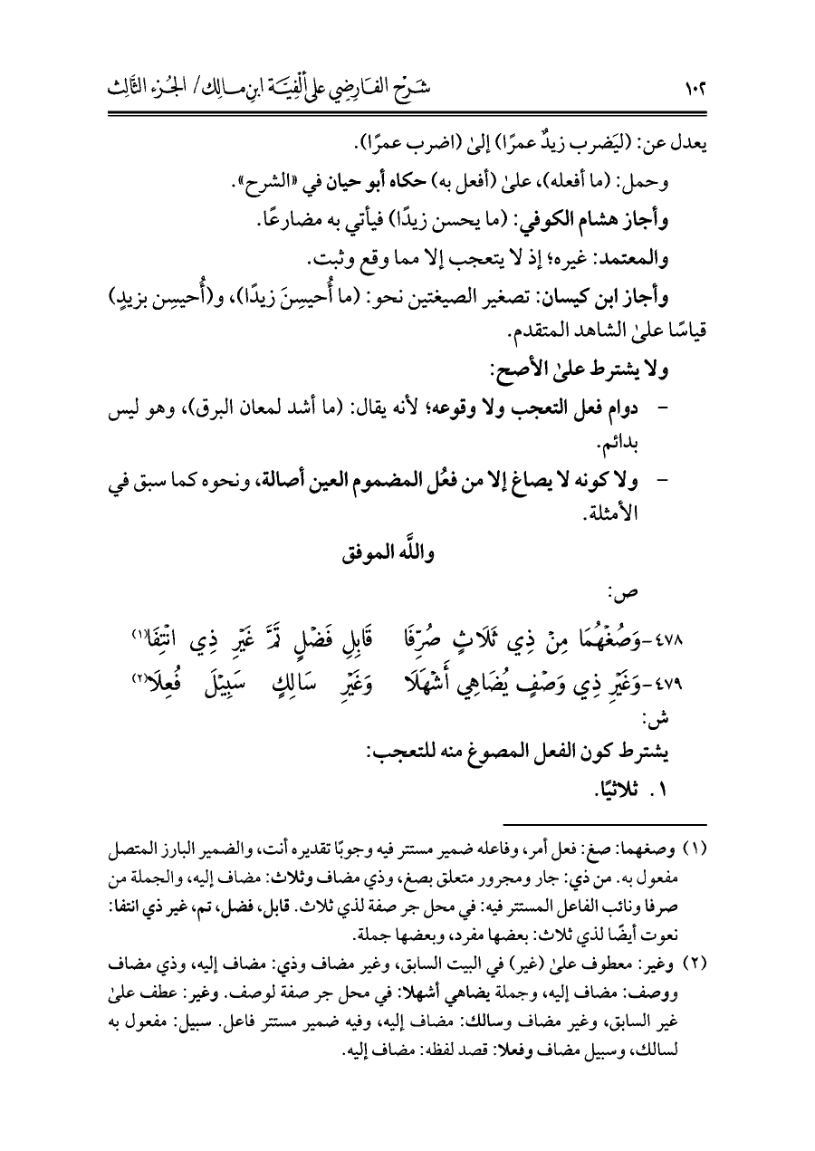 (¬١) وصغهما: صغ: فعل أمر، وفاعله ضمير مستتر فيه وجوبًا تقديره أنت، والضمير البارز المتصل مفعول به. من ذي: جار ومجرور متعلق بصغ، وذي مضاف وثلاث: مضاف إليه، والجملة من صرفا ونائب الفاعل المستتر فيه: في محل جر صفة لذي ثلاث. قابل، فضل, تم غير ذي انتفا: نعوت أيضًا لذي ثلاث: بعضها مفرد، وبعضها جملة.