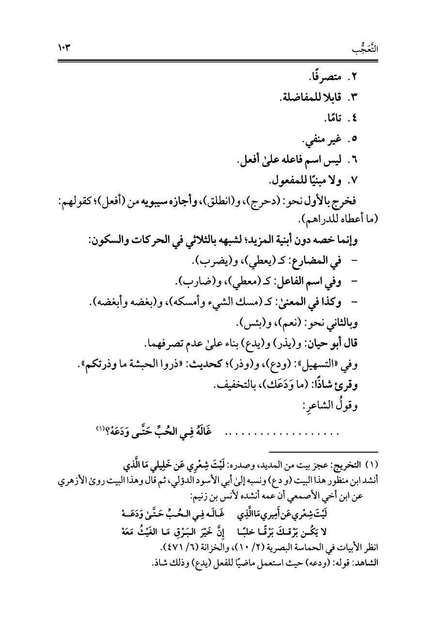 فخرج بالأول نحو: (دحرج)، و (انطلق)، وأجازه سيبويه من (أفعل)؛ كقولهم: (ما أعطاه للدراهم).