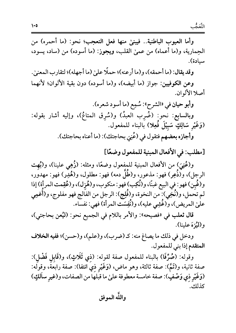 وأما العيوب الباطنية. . فيبنى منها فعل التعجب؛ نحو: (ما أحمره) من الحِمارية، و (ما أعماه) من عمى القلب، ويجوز: (ما أسوده) من (ساد، يسود، سيادة).